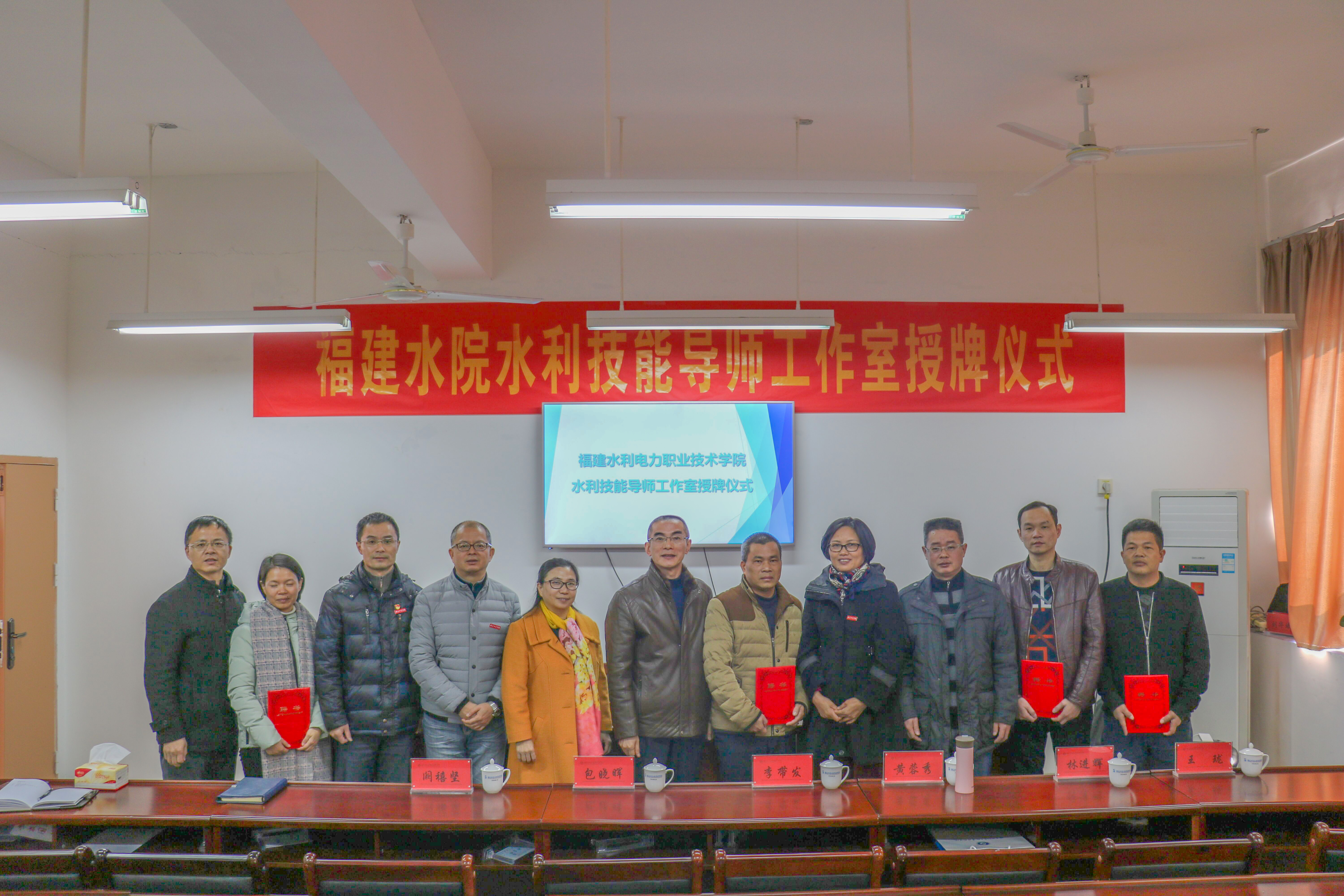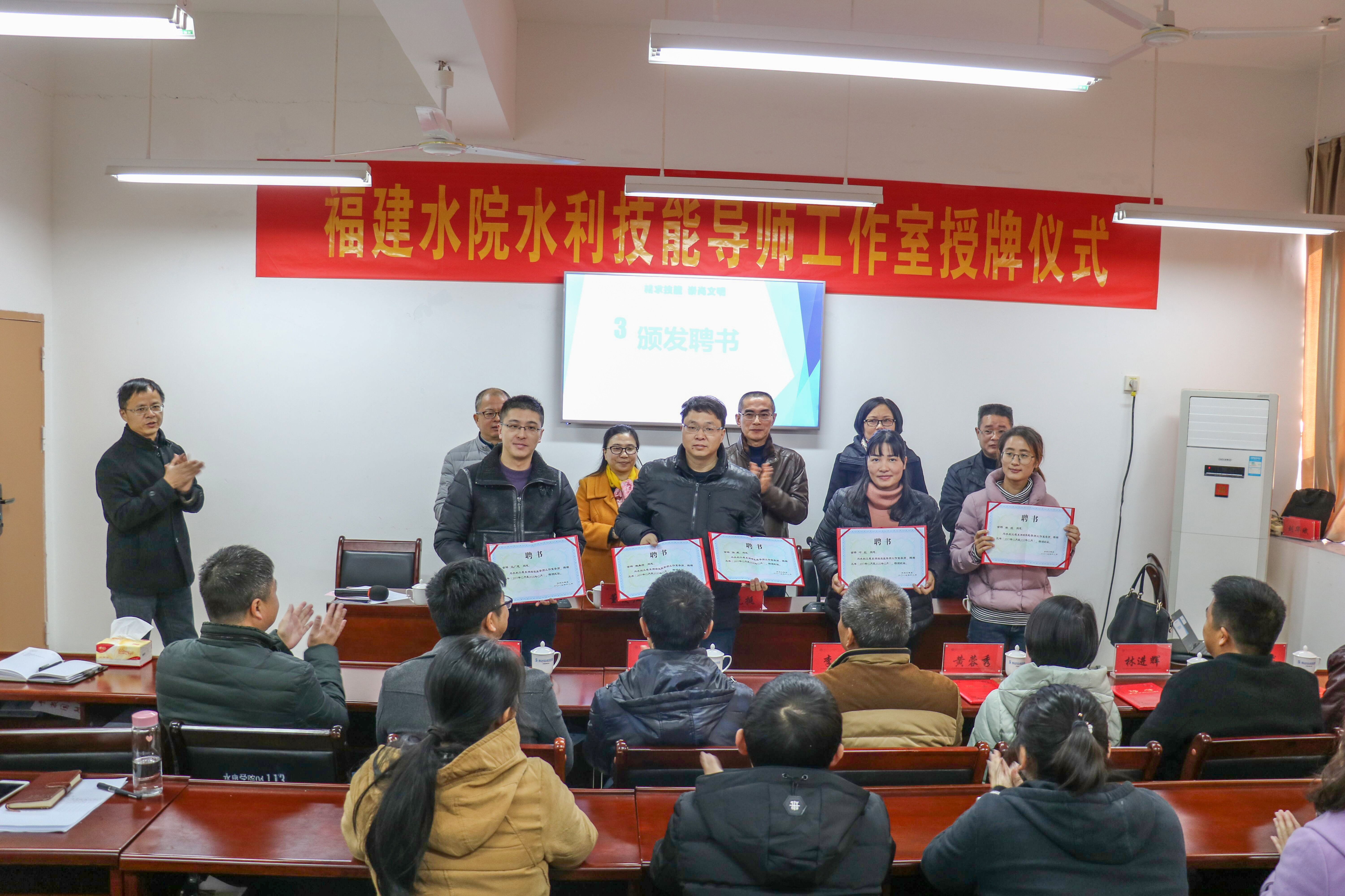 会上,黄瑞梅宣读了学院关于确定水利技能导师工作室首批成员的通知。杨元挺和黄瑞梅分别为学院水利技能导师工作室、水利工程系测绘技能导师工作室负责人授牌,主席台就座领导给李带发(龙岩)、黄蓉秀(三明)、林进辉(泉州)、王珑(南平)4位学院水利技能导师和5位水利工程系测绘技能导师(魏垂场,叶红、任威、马广恩、林波老师)颁发了聘书。