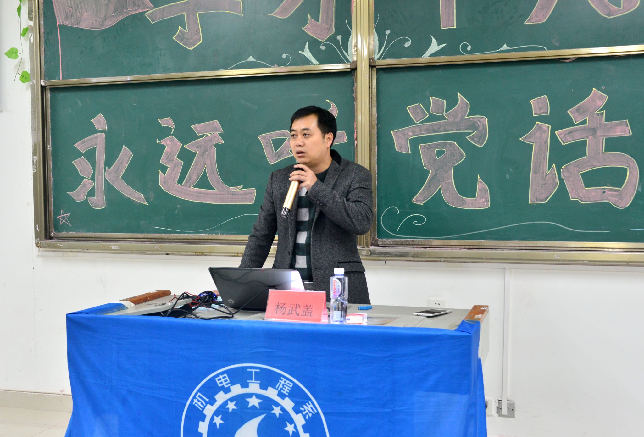 为进一步学习并宣传贯彻党的十九大会议精神,使机电系党员师生、入党积极分子更好的领悟和理解十九大报告的内涵,12月26日,学院“学习贯彻党的十九大精神宣讲团”副团长、副院长杨武盖教授在禹兴园3-105为机电工程系党员师生和入党积极分子做了题为《新时代 新征程 新篇章——深入学习党的十九大报告》专题辅导讲座。讲座由机电工程系党总支书记张云腾主持。
