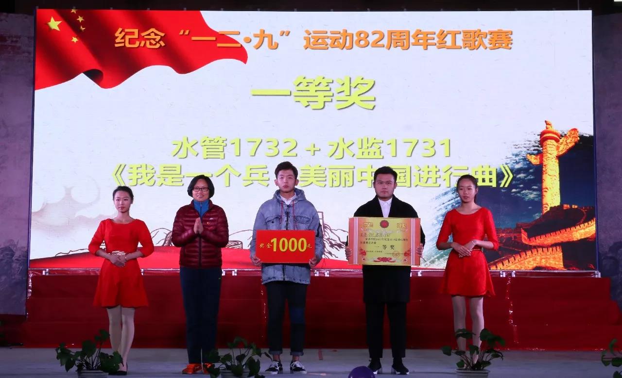 比赛在回顾“一二·九”运动的视频中拉开帷幕。永安“竹之韵”艺术团通过传统乐器笛子、葫芦丝合奏的《强军战歌与唱支山歌给党听》为大赛送上祝福。来自各系部预赛脱颖而出的14支队伍在寒冷的冬夜里唱出温暖,唱出振奋人心的力量,每首歌都赢得了现场观众的阵阵掌声。经过激烈角逐,最后由来自水管1732班与水监1731班共同带来的《我是一个兵+美丽中国进行曲》摘得桂冠,范猷权、黎倩如两位同学获得了本次比赛的优秀指挥。