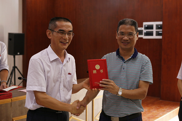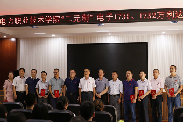 杨院长在开班仪式上讲话。他指出,校企双方应协同组织专门的团队从教学、管理等多方面进行二元制项目的研究、探讨,严格落实双方制定的培养方案,并加强学生课堂教学管理、考勤管理,探索二元制教学考试改革。同时希望被录取的肩任双重身份的在岗职工能够珍惜学习机会,严格遵守学院和公司的各项规章制度,与校企保持互动,合理解决工学之间的矛盾,圆满完成学业。随后,杨院长为“二元制”万利达班的企业兼职教师颁发了学院兼职教师证书和校徽。