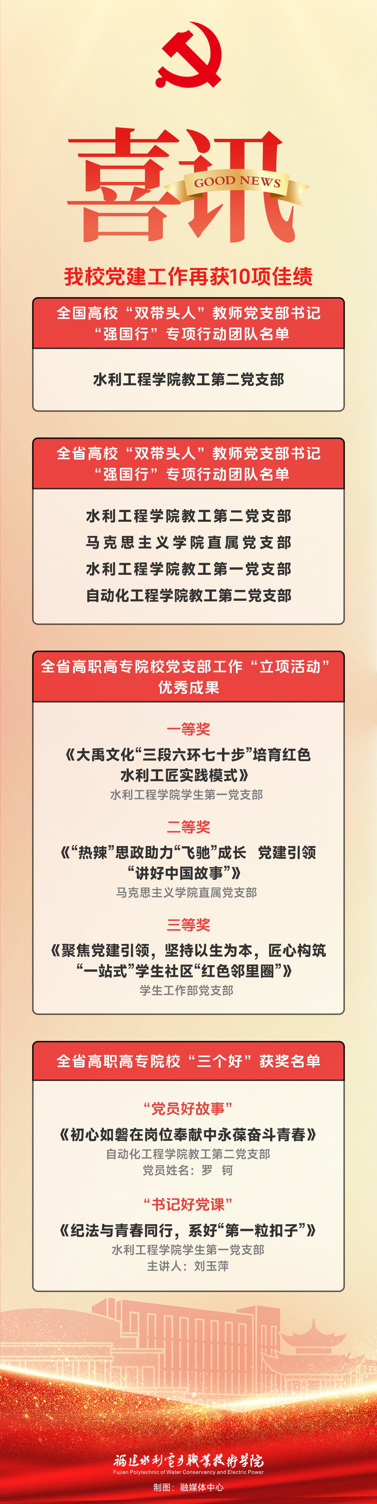 近日,教育部、省委教育工委分别公布了全国和全省高校“双带头人”教师党支部书记“强国行”专项行动团队名单。我校4个团队成功入选全省名单,其中,水利工程学院教工第二党支部同时入选全国名单。省委教育工委公布了2022-2024学年高校党支部工作“立项活动”优秀成果和“党员好故事、书记好党课、支部好案例”获奖名单,我校5个项目获奖。