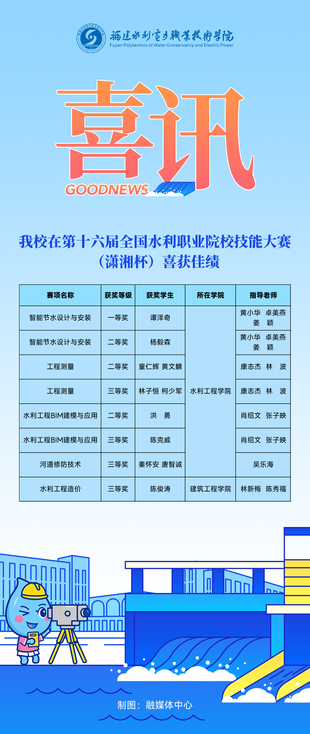 本届大赛共设置智能节水系统设计与安装、水利工程BIM建模与应用、水利工程造价、河道修防技术、工程测量等5个赛项。我校水利工程学院、建筑工程学院选派的15名学生组队参加全部单项竞赛,喜获一等奖1个,二等奖4个,三等奖6个。