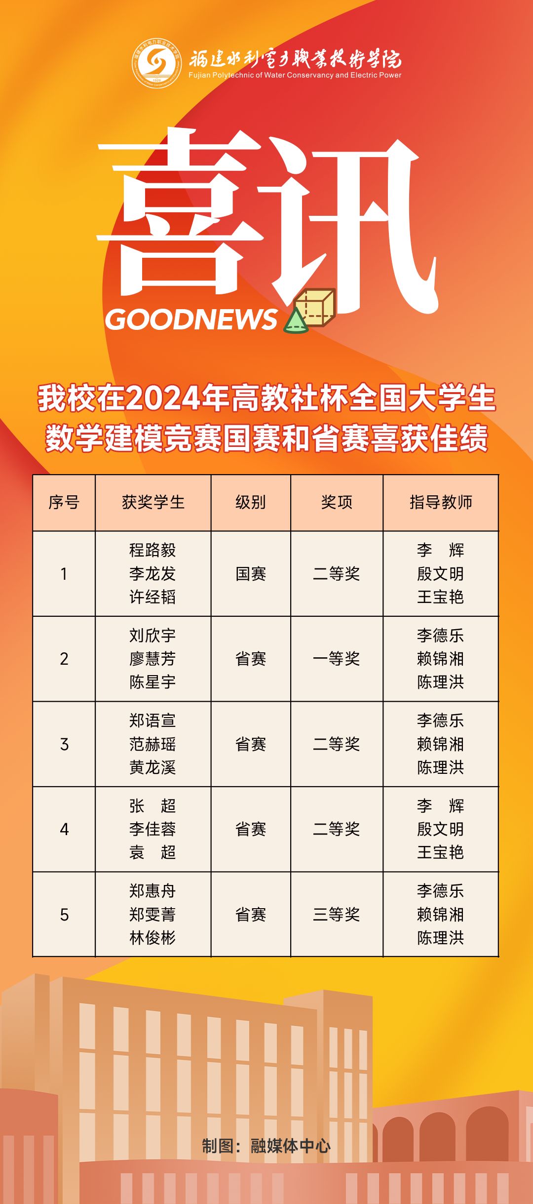 近日,2024年高教社杯全国大学生数学建模竞赛(CUMCM)国赛和省赛获奖名单公布,我校参赛团队喜获国赛二等奖1项,省赛一等奖1项、二等奖2项、三等奖1项。