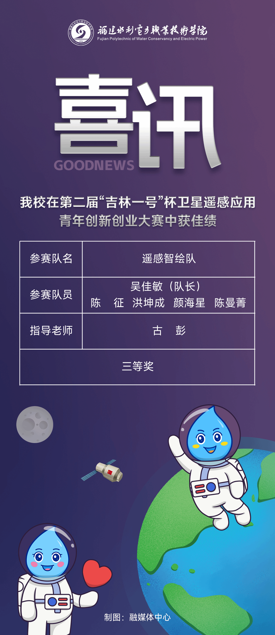 近日,“吉星汇聚 智创未来”第二届“吉林一号”杯卫星遥感应用青年创新创业大赛决赛在长春落幕。我校交通工程学院古彭老师精心指导的由吴佳敏、陈征、洪坤成、颜海星、陈曼菁组成的“遥感智绘队”喜获三等奖。