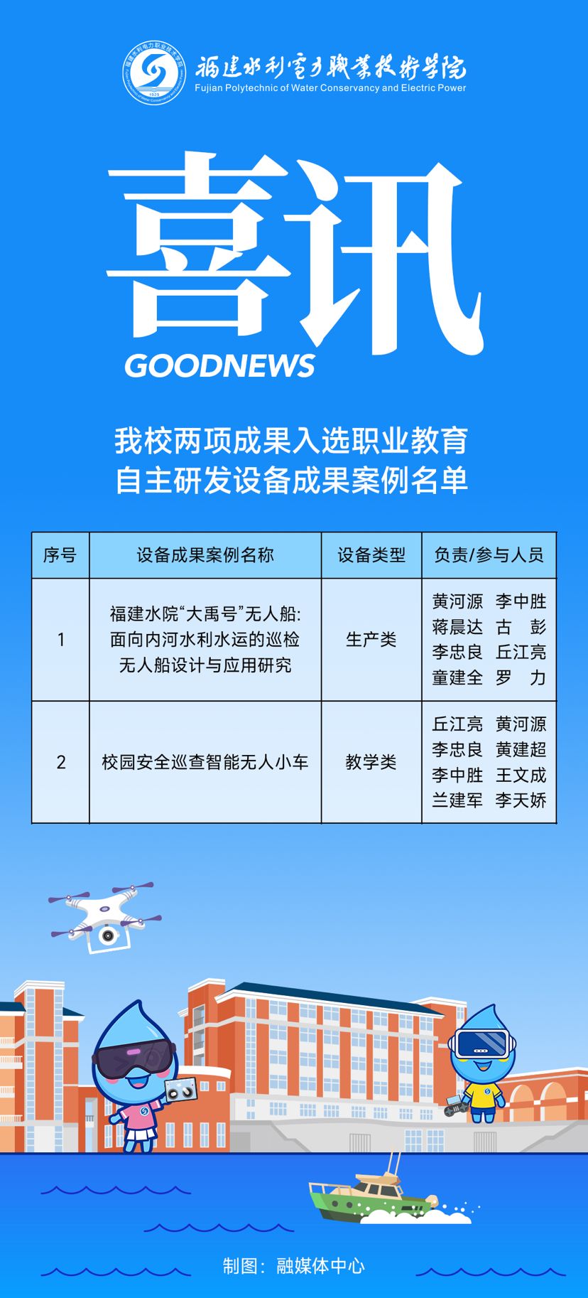 近日,中国职业技术教育学会公布《职业教育自主研发设备成果案例名单的通知》,福建水院师生团队研发的《福建水院“大禹号”无人船:面向内河水利水运的巡检无人船设计与应用研究》《校园安全巡查智能无人小车》二项生产类创新成果成功入选。