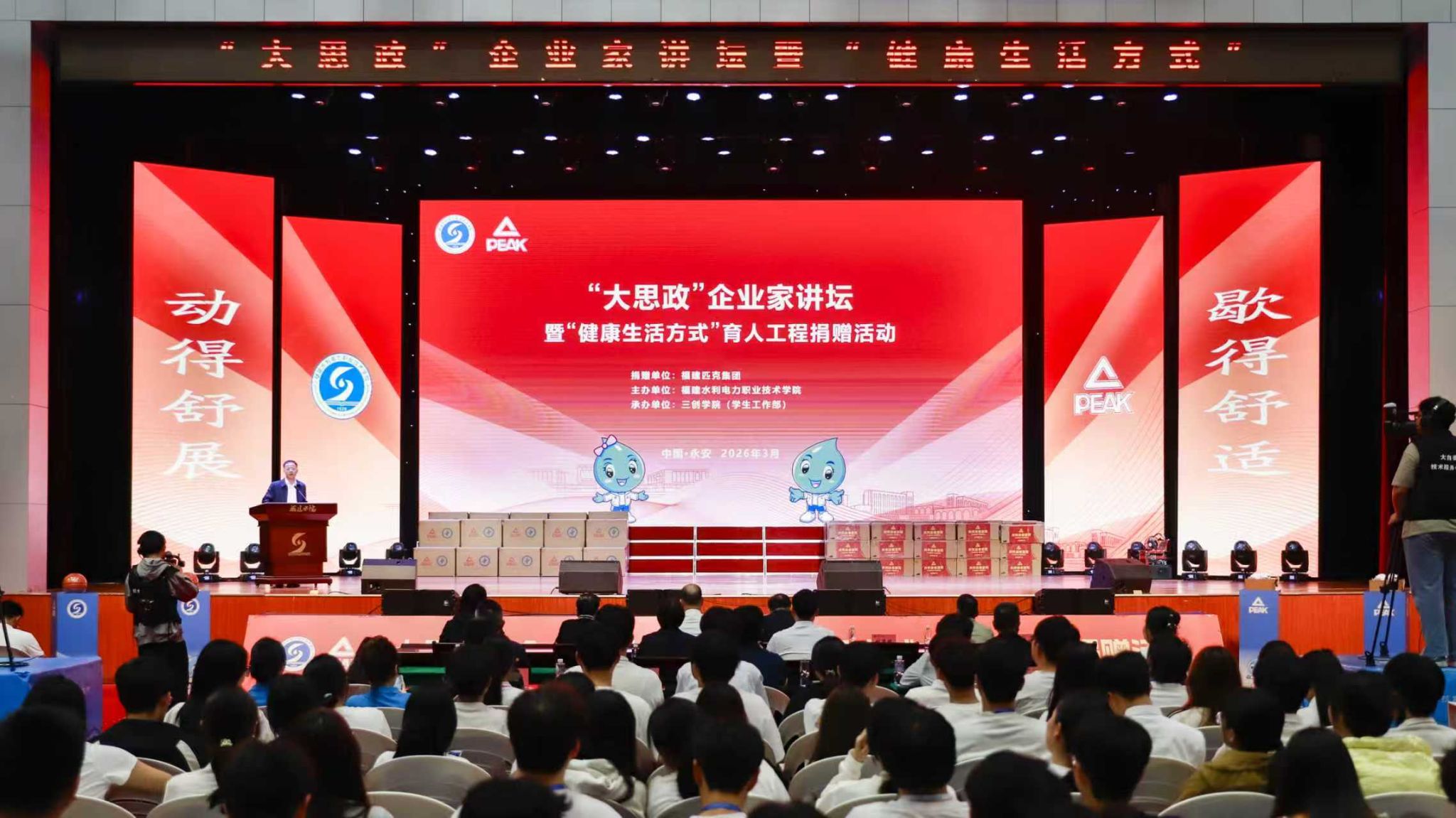 3月24日,学校举办“大思政”企业家讲坛暨“健康生活方式”育人工程捐赠活动。匹克集团创始人、董事长许景南出席活动并作专题讲座。学校党委书记李建兴出席,副校长刘华斌主持活动。