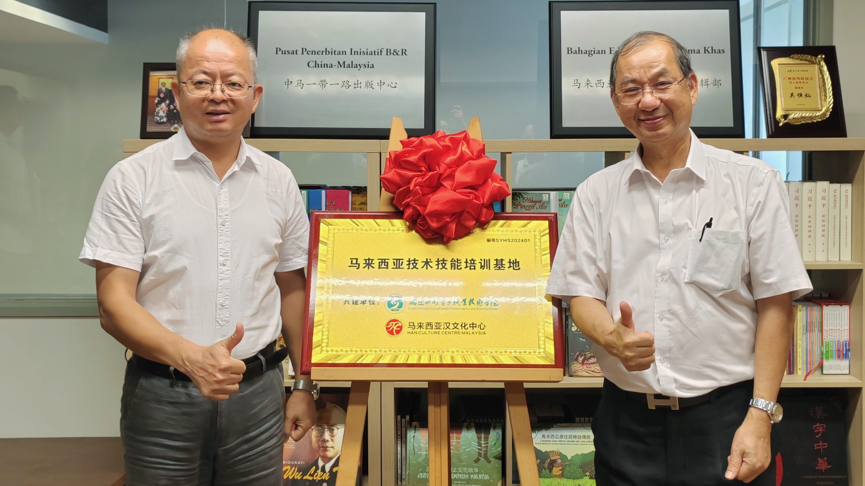 在马来西亚汉文化中心驻马来西亚吉隆坡国家语文局办事处,池长全一行受到了马来西亚汉文化中心主席拿督吴恒灿先生的热情欢迎。吴恒灿表示,福建水院是马来西亚汉文化中心合作的首家高等职业院校,通过三年来的精诚合作,双方在推进“中文+职业技能”培训方面取得一定成效,把中马两国优质的教学资源成功转化为职业教育发展的新动能。池长全结合福建省经济、教育、文化等情况,介绍了学校历史沿革、办学成效、专业特色、职业培训等情况,表达了学校服务“一带一路”倡议的决心,拓展教育国际交流合作的意愿。双方就职业技能培训、留学生联合配合、东海岸铁道工程师培养项目等达成了合作共识,将围绕马来西亚数字经济、绿色经济、职业教育三大国策进一步加强职业教育合作。会谈后,双方签署了合作协议,并共同为“马来西亚技术技能培训基地”揭牌。