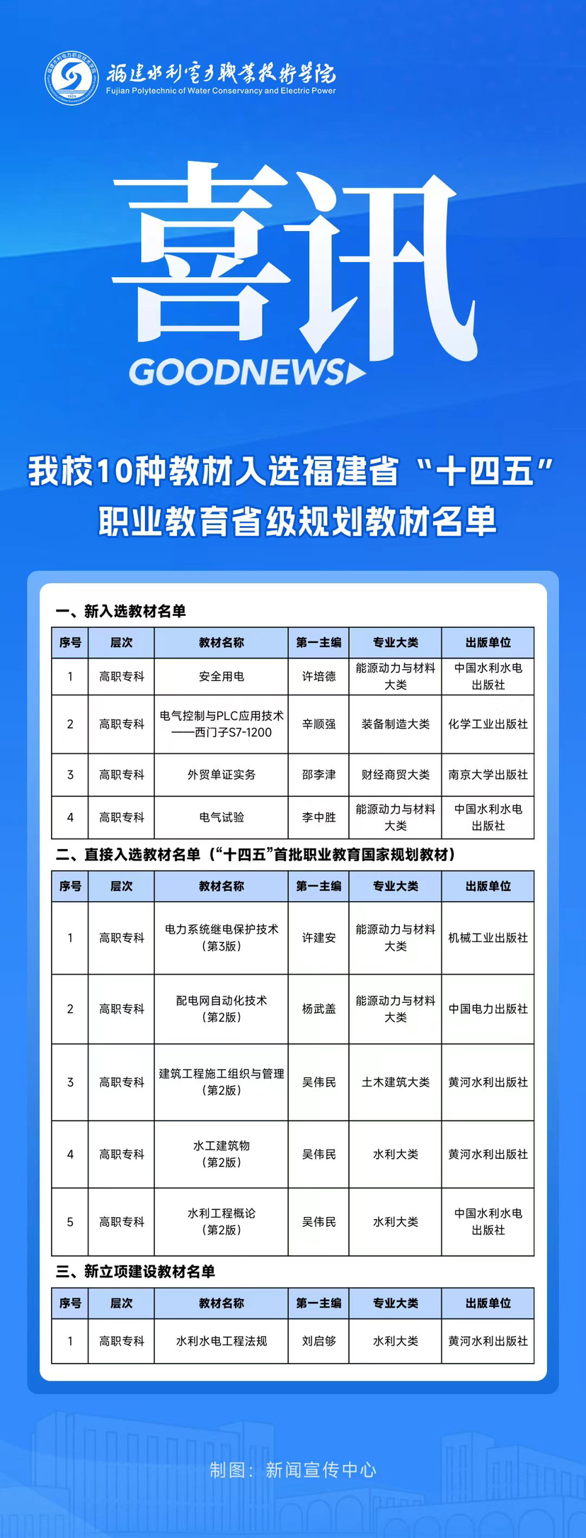 日前,福建省教育厅公布“十四五”职业教育省级规划教材入选和立项建设教材名单。我校教师编写的10种教材成功入选(其中5种为“十四五”首批职业教育国家规划教材直接入选)。