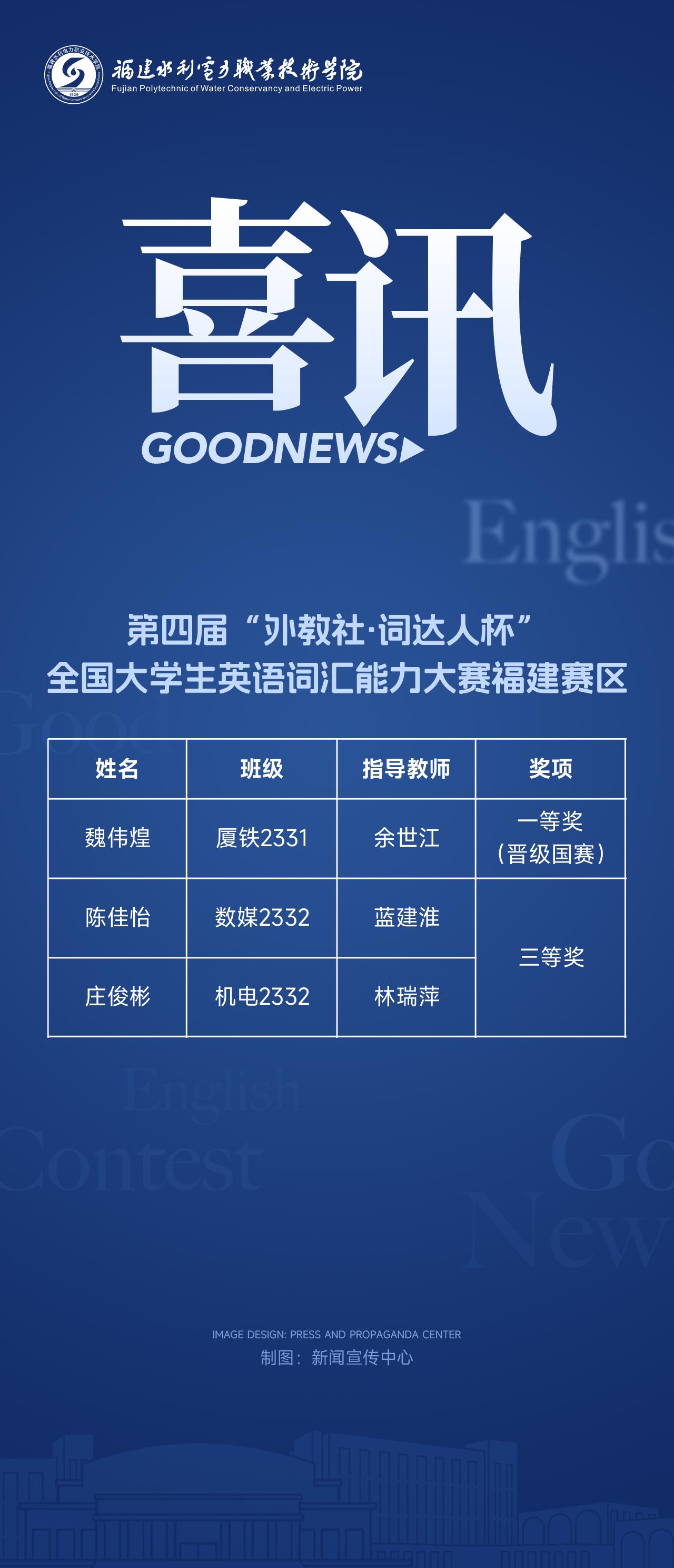 近日,历时近两个月的第四届“外教社·词达人杯”全国大学生英语词汇能力大赛福建赛区比赛圆满落幕。我校学子魏伟煌(厦铁2331,指导教师:余世江)获得省赛高职高专非英语类专业组一等奖,晋级国赛。