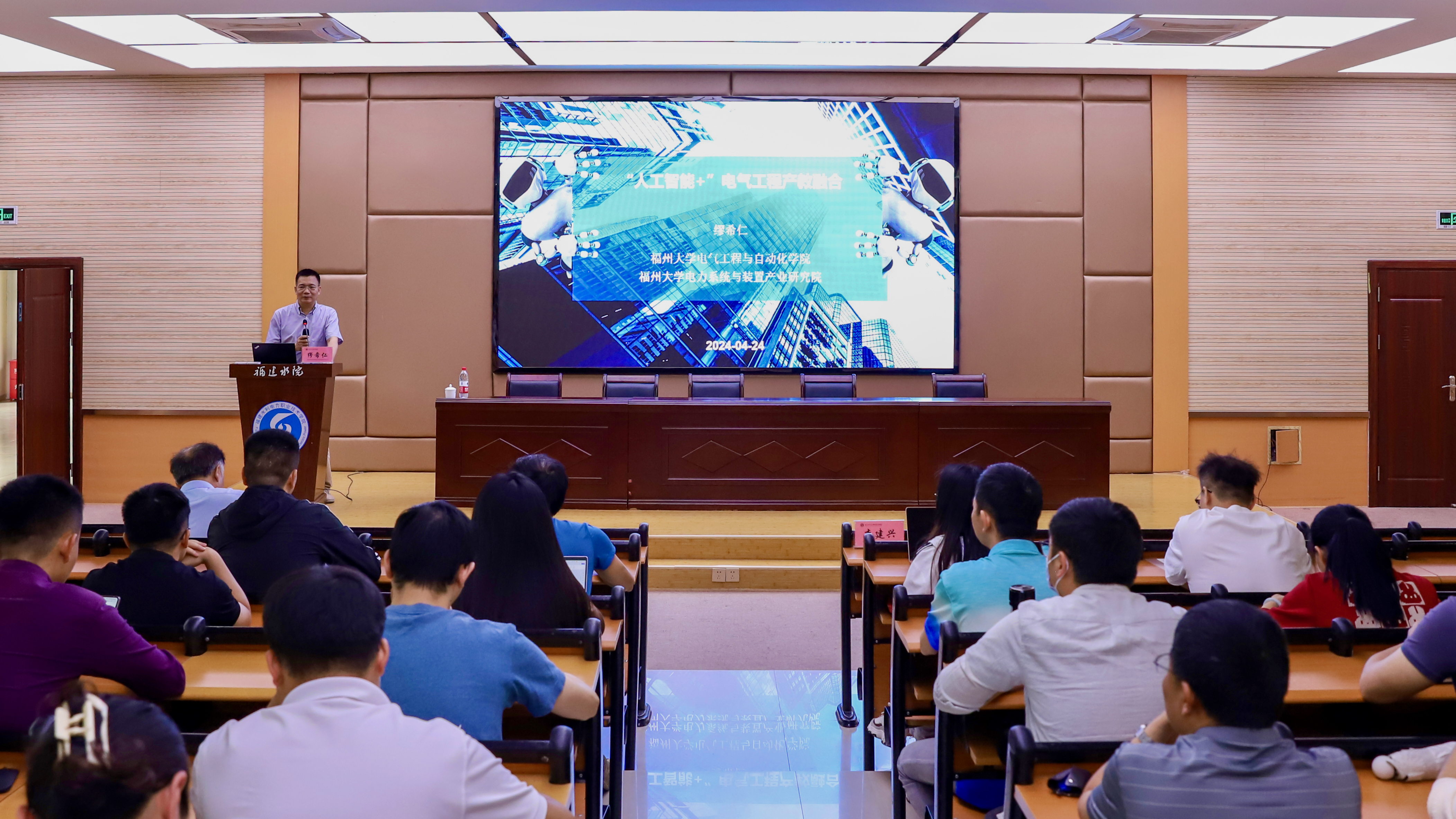 4月24日上午,福州大学电气工程与自动化学院博士生导师缪希仁教授莅校开展《人工智能+电气工程产教融合》专题讲座,学校党委书记李建兴出席。