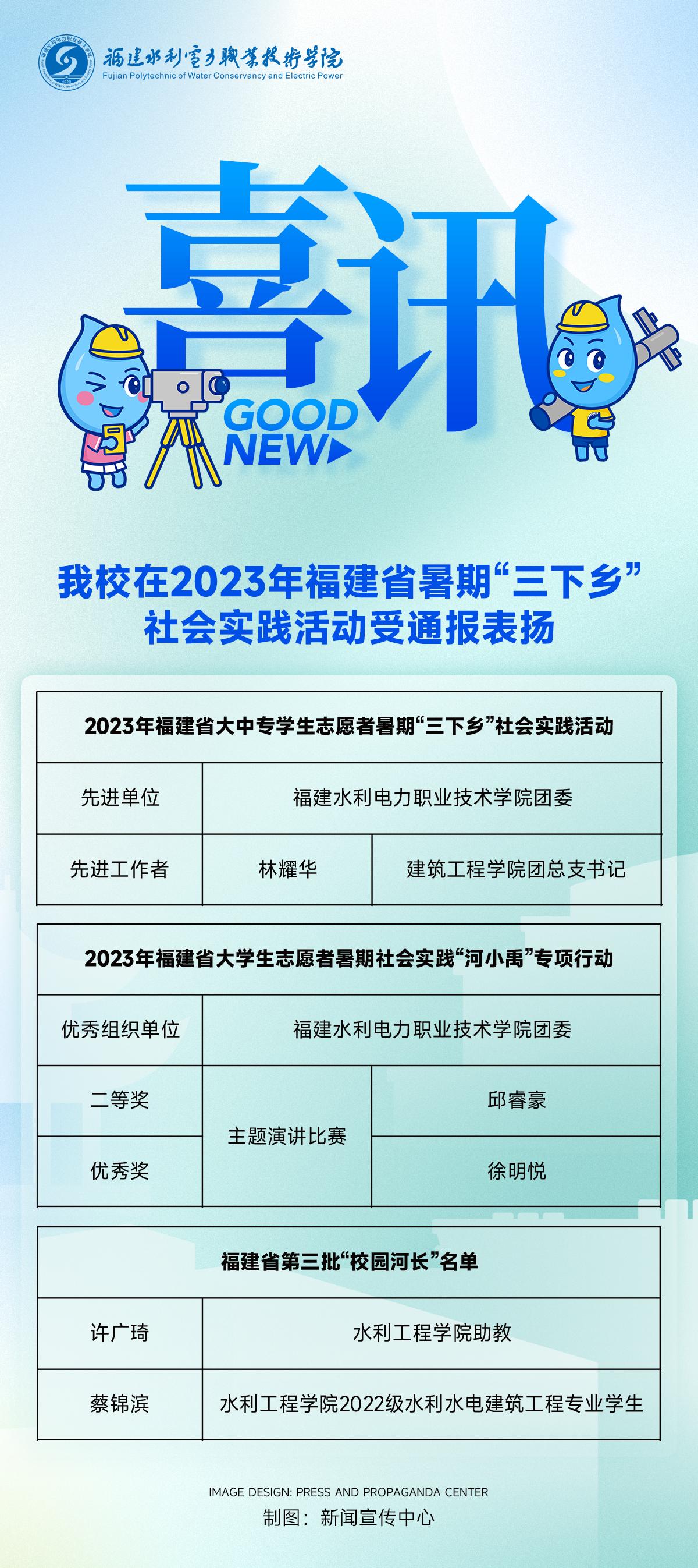 近日,团省委、省委宣传部、省委教育工委等9家单位联合通报表扬了在2023年福建省大中专学生志愿者暑期文化科技卫生“三下乡”社会实践活动中表现突出的集体和个人,我校共有7个集体或个人获奖。