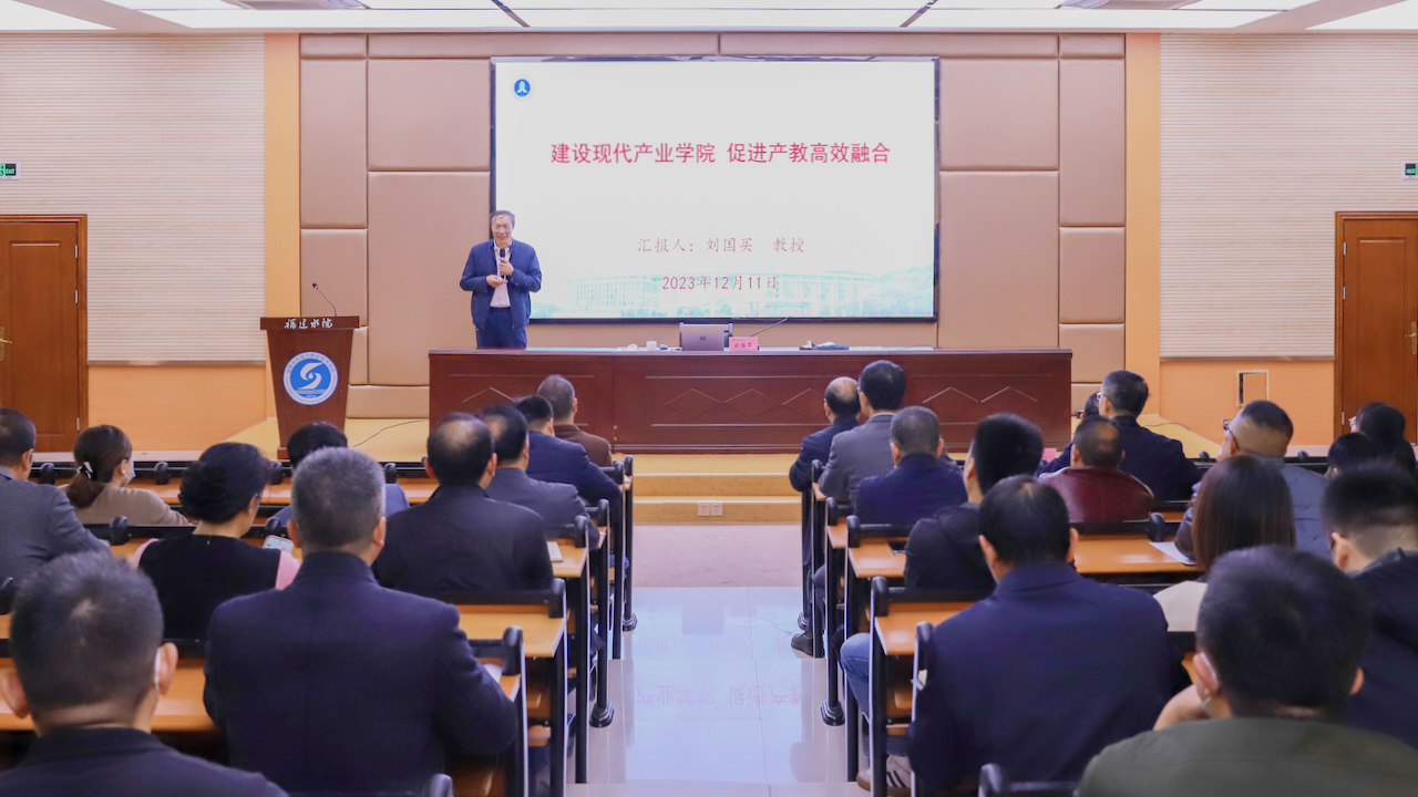 12月12日上午,学校特邀福建理工大学党委常委、副校长刘国买教授莅校开展产教融合专题讲座。学校党委书记李建兴、纪委书记邱祥光,学校副科及以上干部,各教研室负责人,副高及以上职称教职员工共计200余人到场聆听。讲座由李建兴主持。