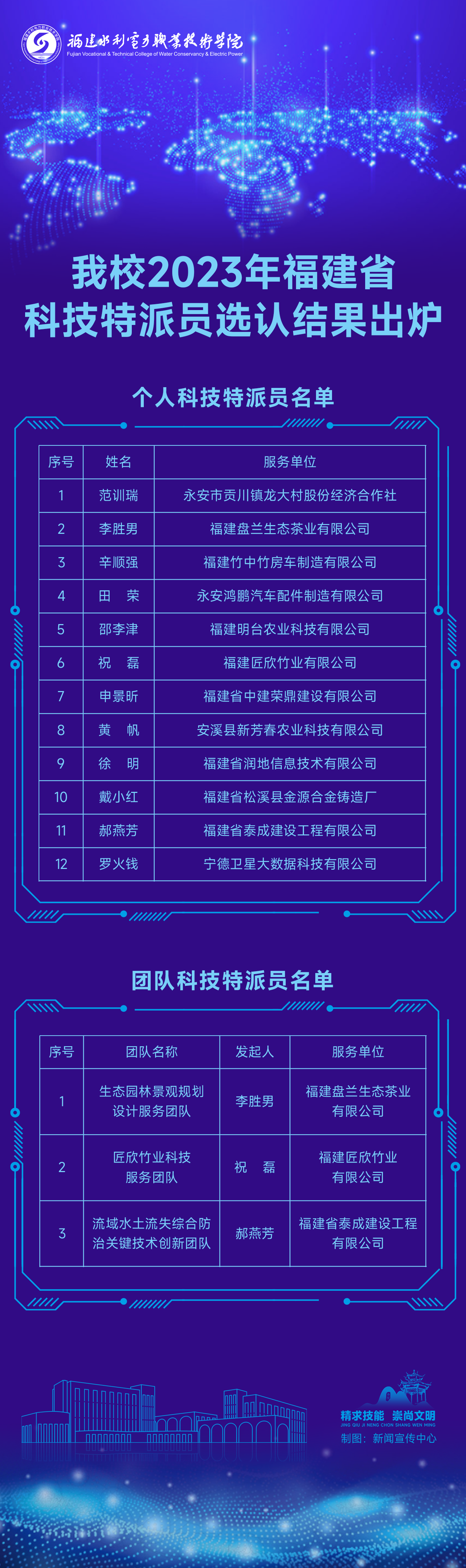 日前,福建省科技特派员工作联席会议办公室公布2023年福建省科技特派员选认结果,我校邵李津教授等12名教师被选认为2023年福建省个人科技特派员,郝燕芳博士发起的流域水土流失综合防治关键技术创新团队等3支科技服务团队被选认为2023年福建省团队科技特派员,选认数量位居全省高职院校前列。