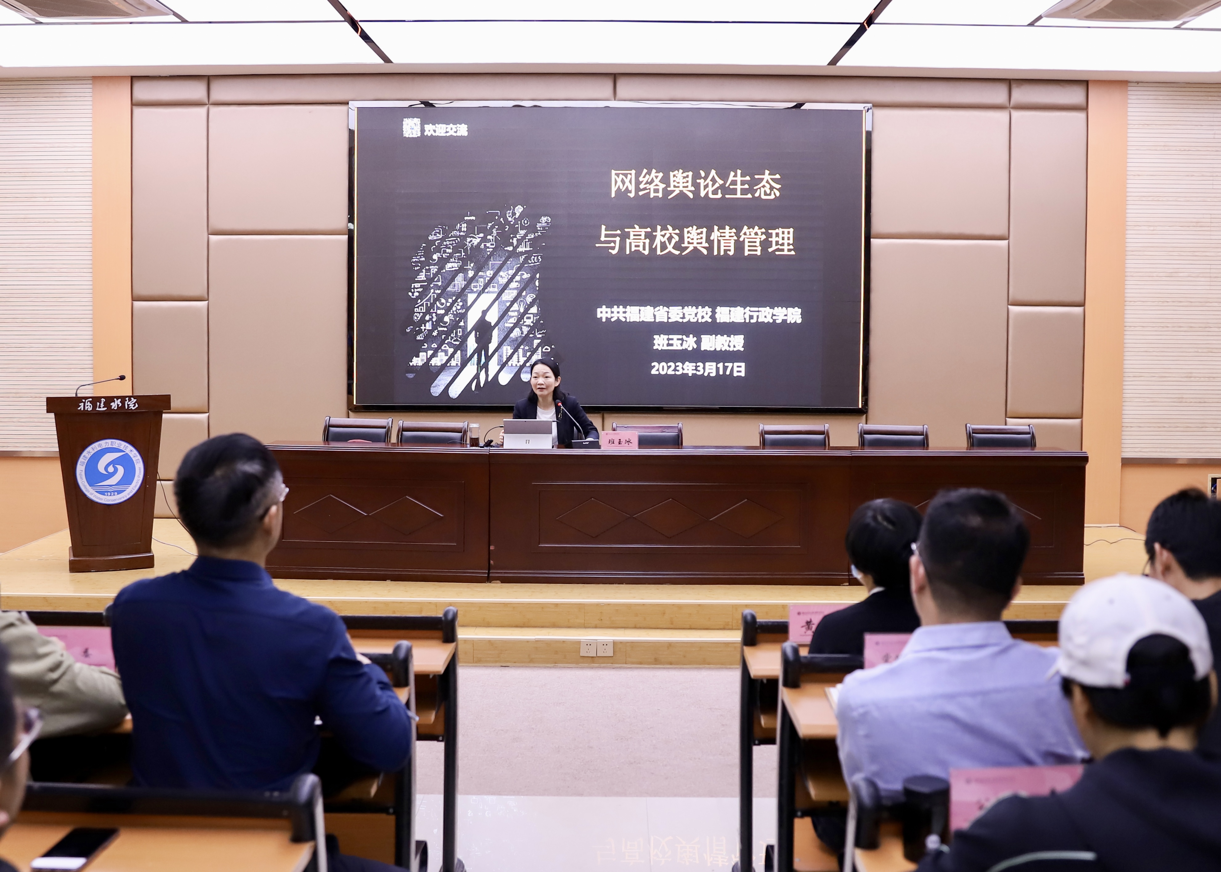 3月17日,我校举办2023年舆情管理工作专题培训。特邀中共福建省委党校公共管理教研部副主任、省应急管理培训基地副主任、省舆情信息专家库专家班玉冰副教授莅校作“网络舆论生态与高校舆情管理”专题讲座。学校党委副书记黄瑞梅出席。