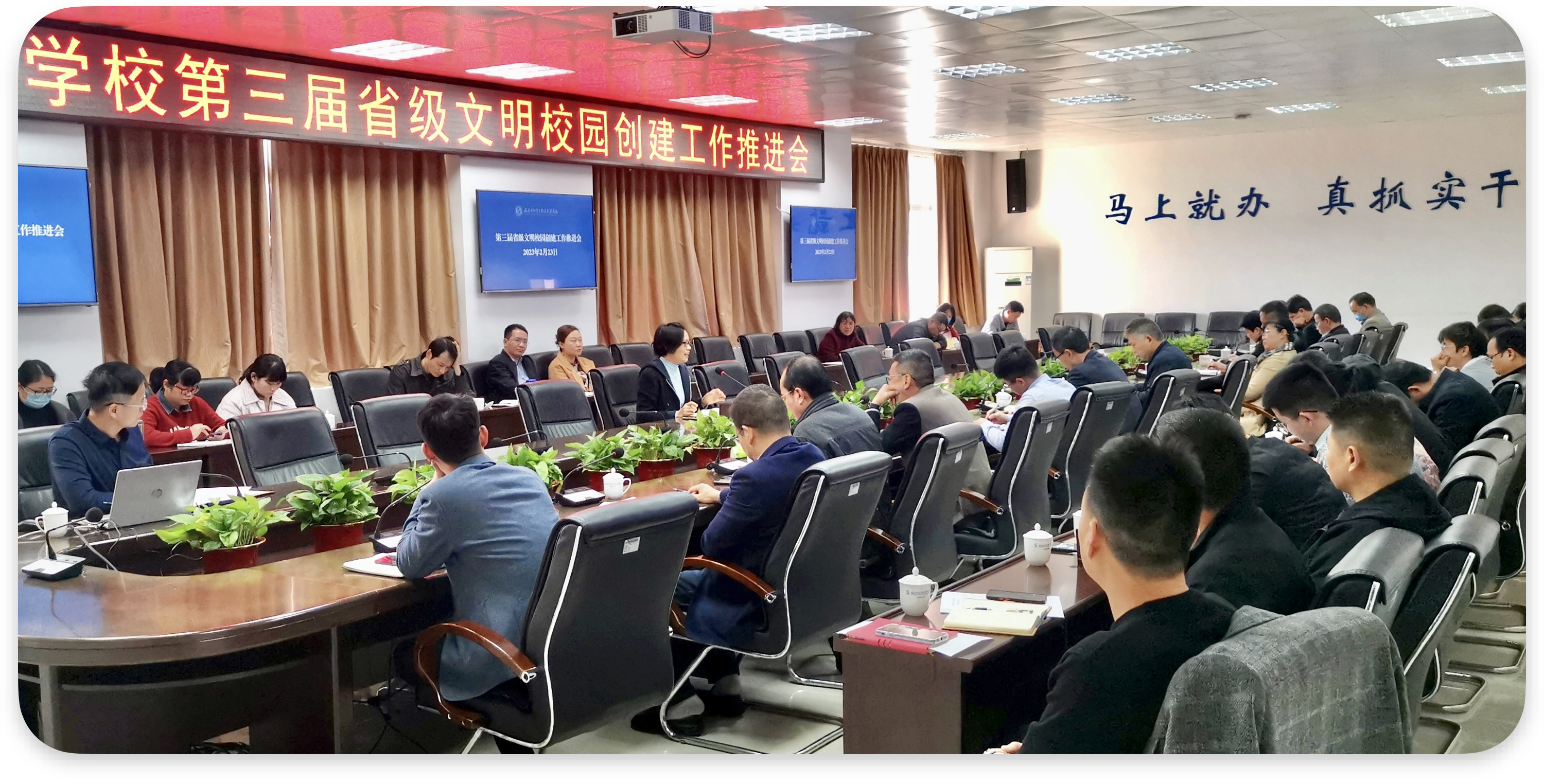 2月23日,学校召开第三届省级文明校园创建工作推进会,学校党委副书记黄瑞梅出席会议并讲话,各部门、各院(部)负责人及负责文明校园创建工作人员等参加会议。