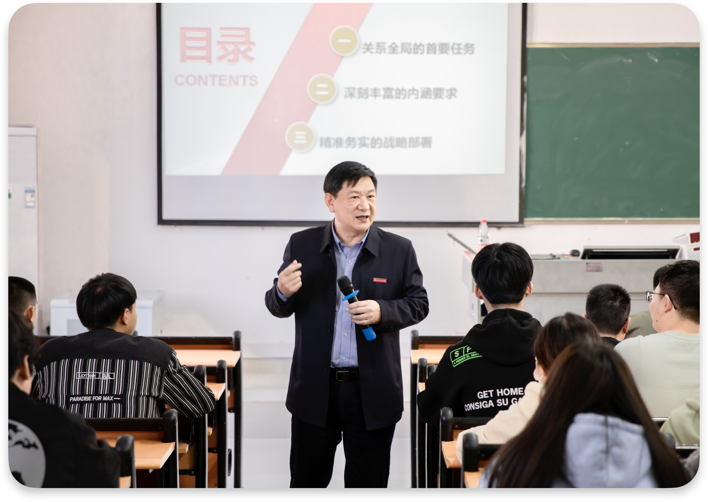 孙学耕校长以《开创高质量发展新局面》为题,围绕“关系全局的首要任务”“深刻丰富的内涵要求”“精准务实的战略部署”三部分内容展开。结合专业特色,用丰富的数据实例讲述了我国经济社会发展取得的卓越成效;以问题为导向,通过启发式教学引导同学们“解题”,鼓励同学们将关注国家社会时事同自身专业学习相结合,立志走好技能成才、技能报国路;通过亲身经历和视角,与同学们分享了改革开放以来社会发展取得的伟大成就,特别是新时代以来,社会发生的巨大变化,生动形象地将道理讲深、讲透、讲活。