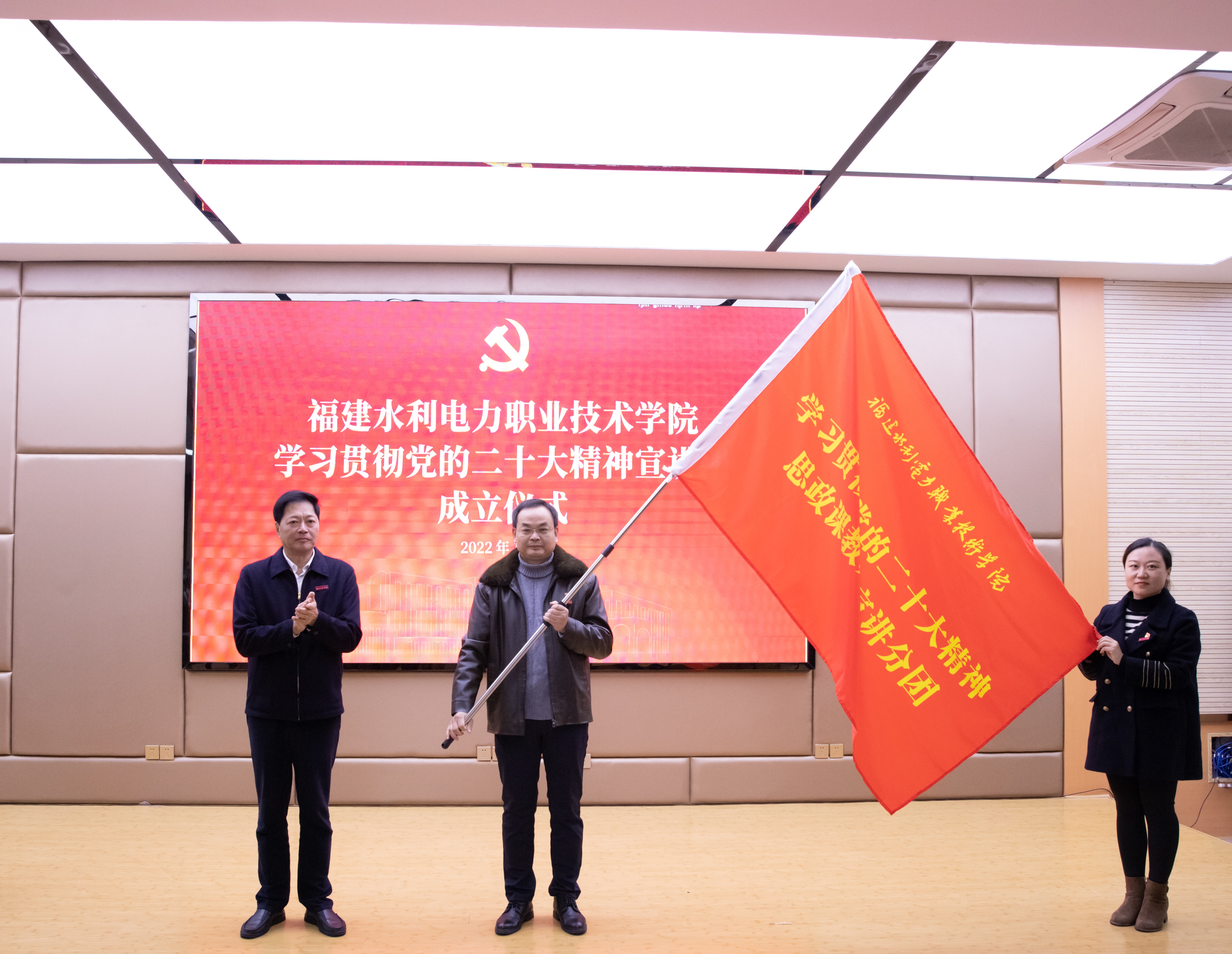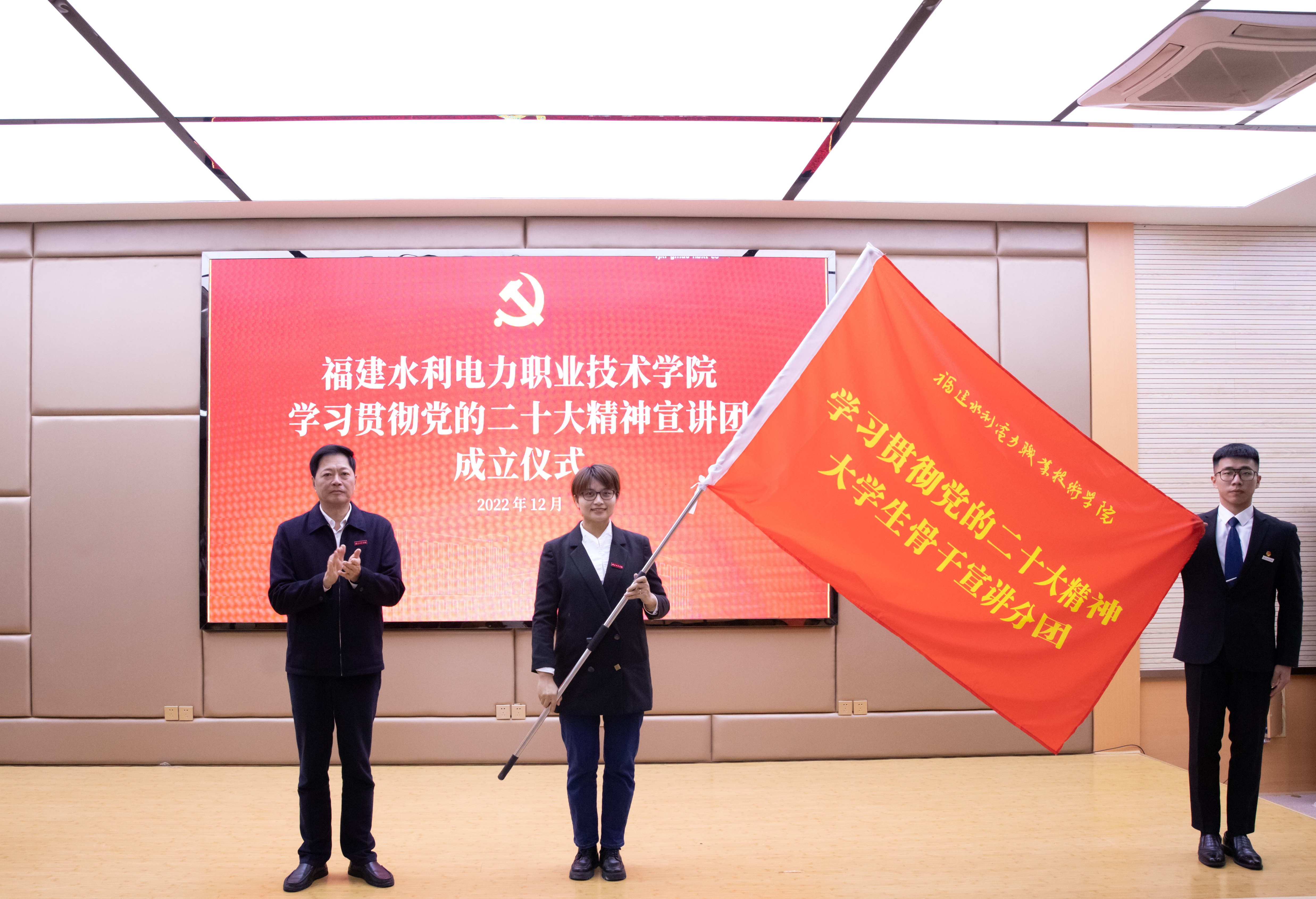 仪式上,庄伟廉分别为三个宣讲分团授旗。黄瑞梅、包晓晖同志代表党员领导干部宣讲分团接旗,张盛文、杨奇靖同志代表思政课教师宣讲分团接旗,庄娟瑜同志和学生陈可集代表大学生骨干宣讲分团接旗。