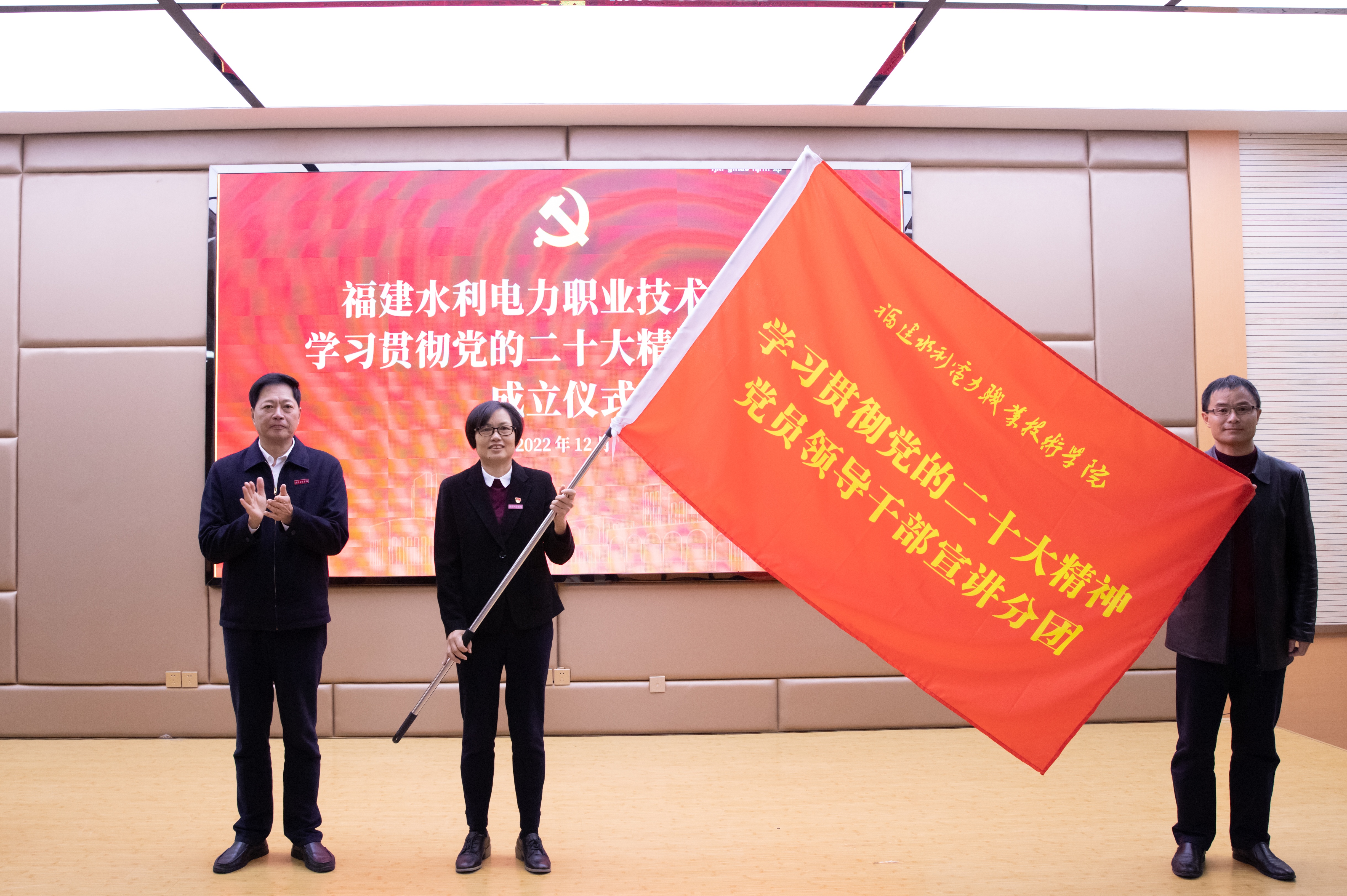 12月6日,学院学习贯彻党的二十大精神宣讲团成立仪式在第一学术报告厅举行。党委书记庄伟廉出席并作动员讲话,党委副书记黄瑞梅主持仪式。