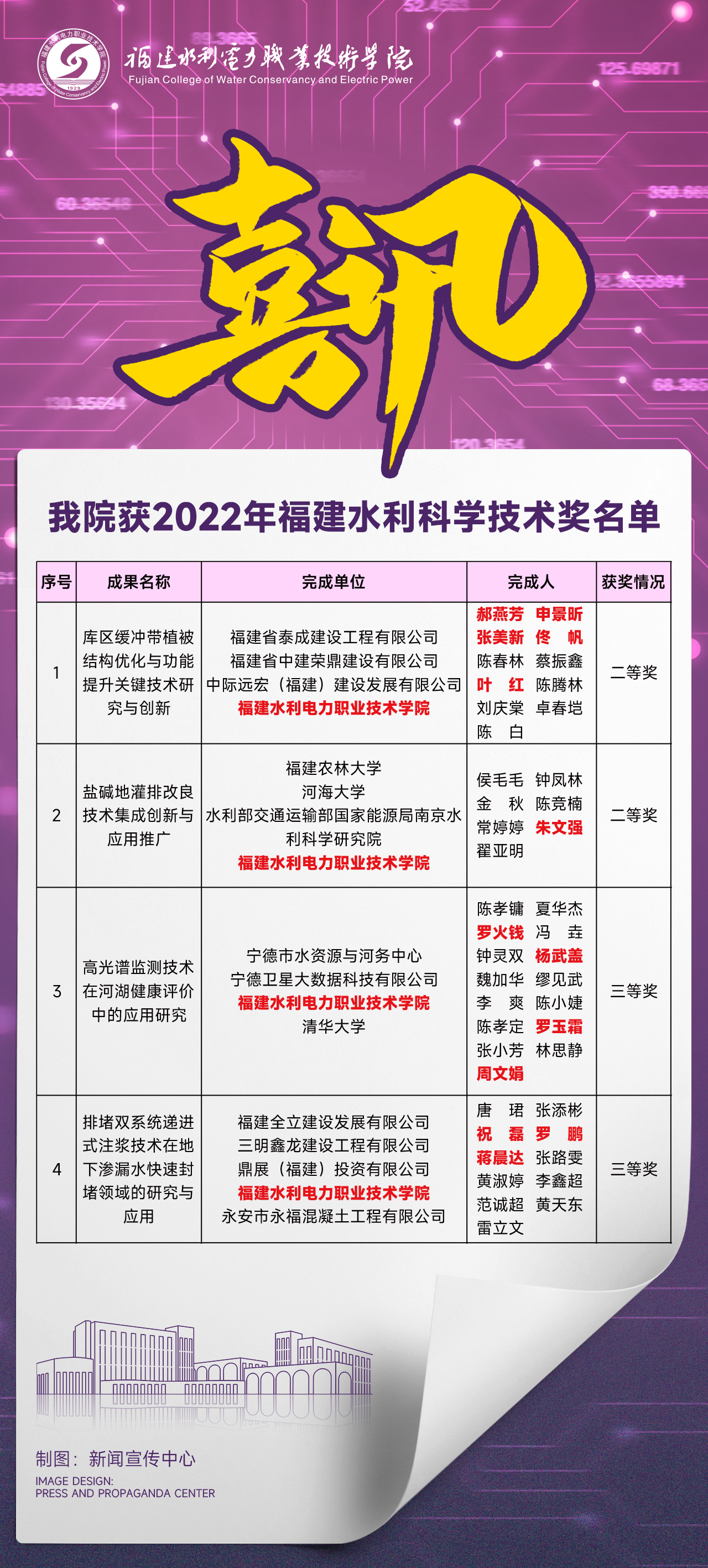 近日,经福建水利科学技术奖评审委员会会议评审,评出了2022年福建水利科学技术奖项目47项,其中一等奖8项、二等奖15项、三等奖24项。我院与本科院校、企事业单位合作的4个项目成果获评二等奖2项,三等奖2项,获奖项目数量创历史之最。