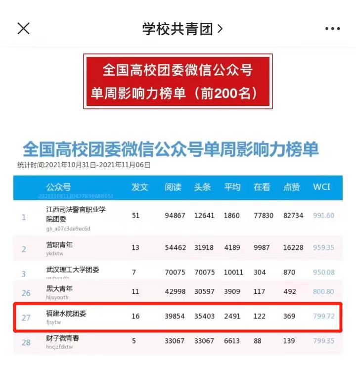 我们持续推送《悦读汇》栏目,通过公众号发布的《水院版壁纸》《水院版校园穿搭》《醉美迷彩风》等系列原创推文累计收获10w+阅读量,其中《快来pick你最喜欢的运动会表演吧!》更是收获了2.7w的阅读量,运营的“福建水院团委”公众号多次上榜“全国高校团属微信公众号单周影响力榜单”。