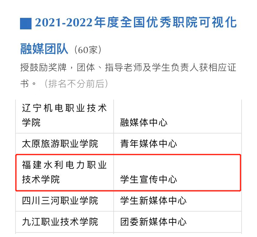 2022年,中国青年报、中国青少年新媒体协会、中青校媒共同举办“2021-2022高校可视化新闻激励计划·寻找高校可视化融媒团队”活动,通过展示高校媒体团队的可视化内容、优质品牌活动、团队影响力等,对高校媒体团队进行综合筛选、评定。