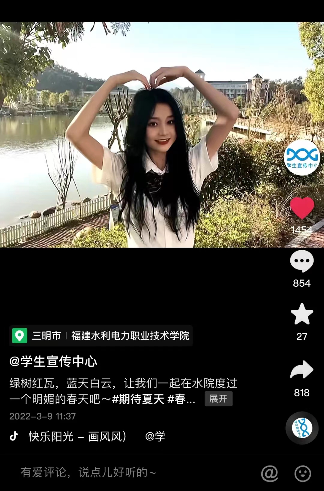 截至2022年3月,“学生宣传中心”抖音号粉丝量突破2281人,累计获赞超10000人次,原创视频总浏览量高达4582w人次。其中,原创视频“开学季,新生校园街拍”“高校版女神节手势舞”分别获得8.6w人次浏览量、13.5w人次浏览量。利用视频直播优势为“美丽乡村挑战赛”“世界水日·中国水周水利科普”等重要活动网络直播5次,全网收看量累计突破10000人次,获赞超230w人次。