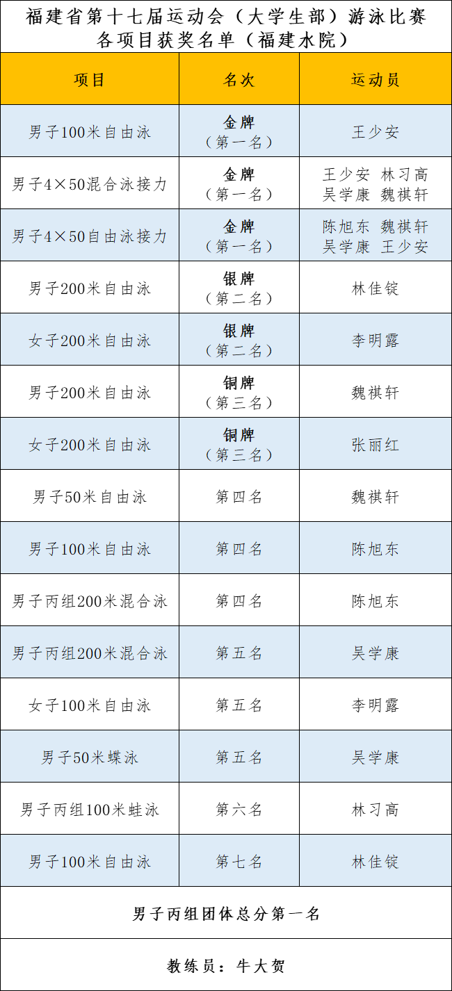 7月30日,由省教育厅、省体育局主办的福建省第十七届运动会(大学生部)游泳比赛在厦门大学翔安校区落下帷幕。经过激烈角逐,我院代表队喜获3金2银2铜,并获游泳比赛男子团体总分第一名的优异成绩。
