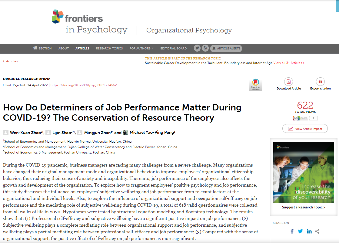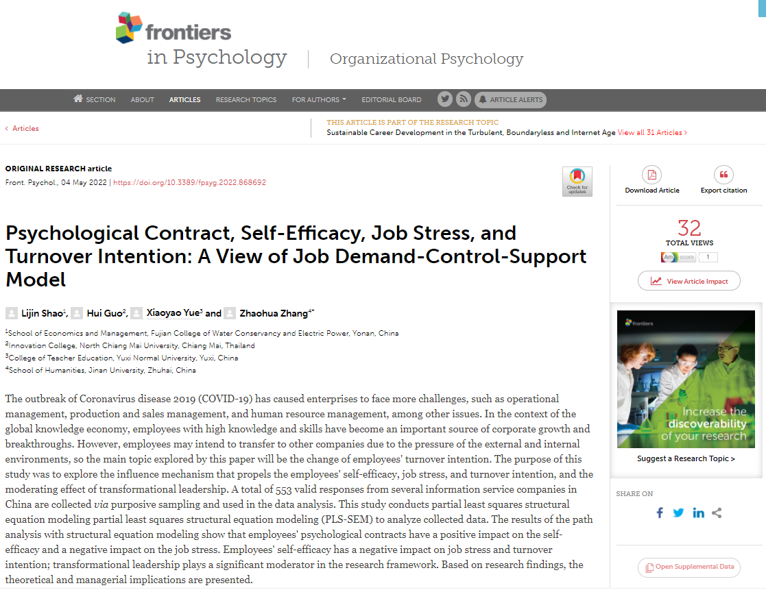 近日,我院邵李津博士分别以第一作者和通讯作者、共同第一作者的身份在国际学术权威期刊《Frontiers in psychology: Organizational Psychology》上连续发表了题为“Psychological Contract, Self-Efficacy, Job Stress, and Turnover Intention: A View of Job Demand-Control-Support Model”(基于工作需求-控制-支持模型的心理契约、自我效能、工作压力与离职倾向研究)和“How Do Determiners of Job Performance Matter During COVID-19?The Conservation of Resource Theory”(基于资源保护理论的新冠疫情下工作绩效的影响因素研究)两篇高水平学术论文,这是我院教师首次以第一作者身份,在国际高水平社会科学引文索引期刊上发表学术论文,标志着学院在组织行为管理、组织心理等社会科学领域的研究取得了新的进展和突破。