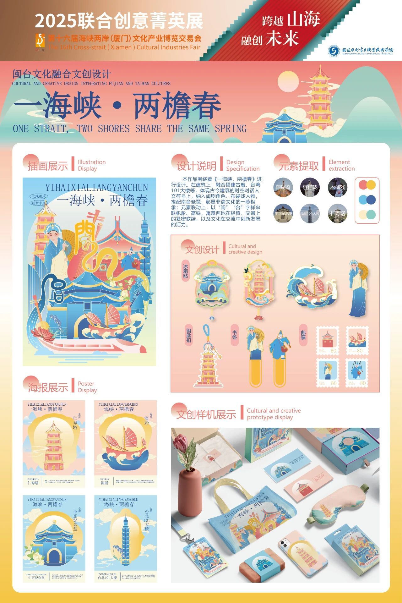 该作品围绕闽南、台湾的地标建筑(如闽南特色楼阁、台湾人文景观)与文化符号(闽南民俗、台湾人文意象)展开创作,通过插画展示、海报设计、文创产品(徽章、邮票、文创周边等)多维度呈现,以明快的色彩和富有创意的视觉语言,诠释“两岸同春,文旅共荣”的核心理念。