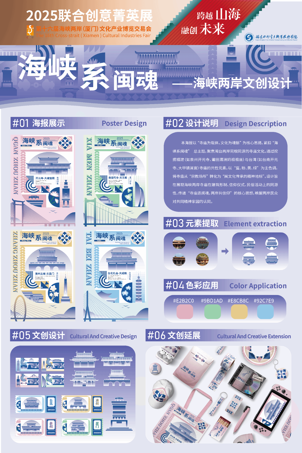 该作品围绕泉州开元寺、厦门南普陀、漳州古城与台湾孔庙等标志性建筑为元素展开创作的系列海报,提取“蓝、红、黄、绿”为主色调,通过海报展示、文创设计、文创延展等多维度呈现,将建筑符号升华为“文化传承的精神地标”。