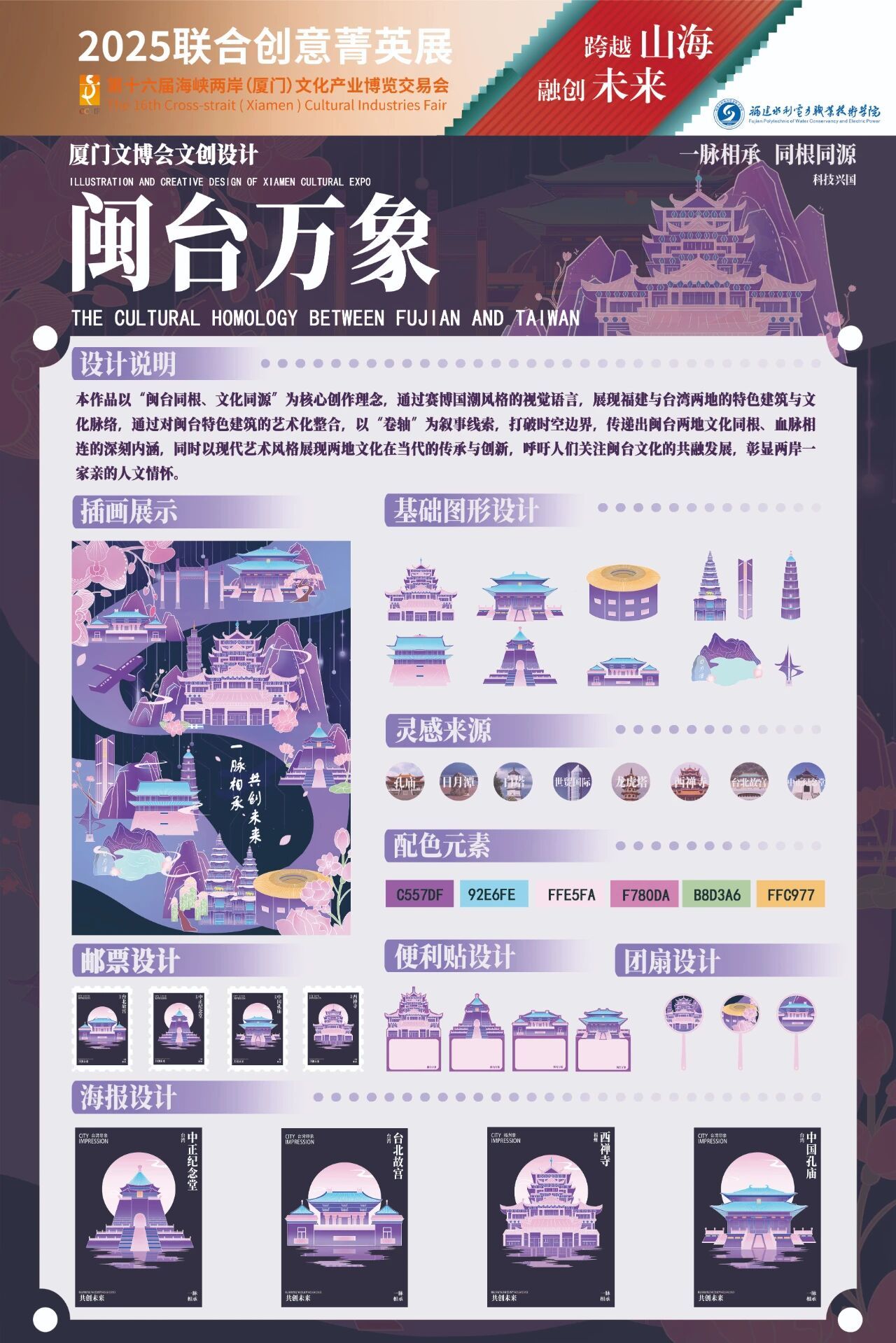 该作品以赛博国潮风格展现,融合福建土楼、台湾台北故宫等闽台标志性建筑元素,以“卷轴”为叙事线索打破时空边界,通过插画展示、邮票设计、海报设计、文创设计(便贴、团扇等)多维度呈现,传递出闽台两地文化同根、血脉相连的深刻内涵,呼吁关注闽台文化共融发展,彰显两岸一家亲的人文情怀。