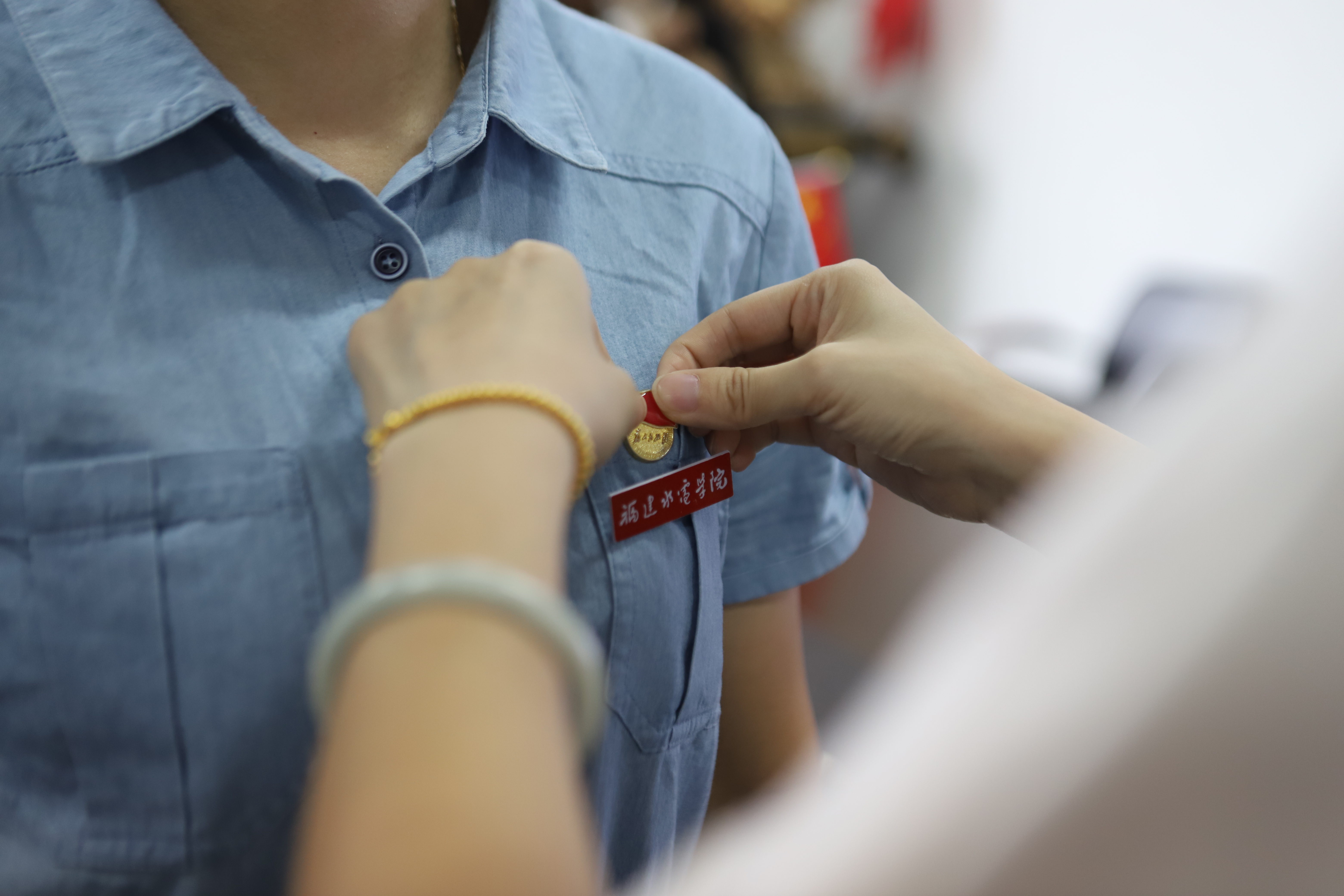 教工支部与学生支部为每位党员配发党员徽章,党员两两一组,将崭新的党员徽章统一佩戴在左胸中间位置,擦亮党员徽章,亮出身份,把党员标准立起来,形象树起来。