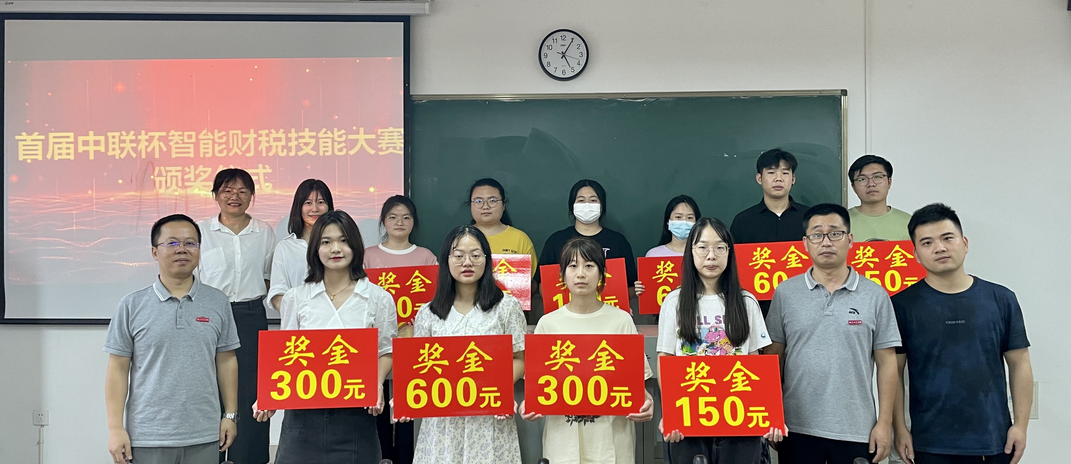 近日,经济管理学院与中联集团教育科技有限公司联合举办首届中联杯智能财税技能竞赛,公司销售总监章雪珍、技术部经理吴伟亲临现场观摩并为获奖选手颁奖。