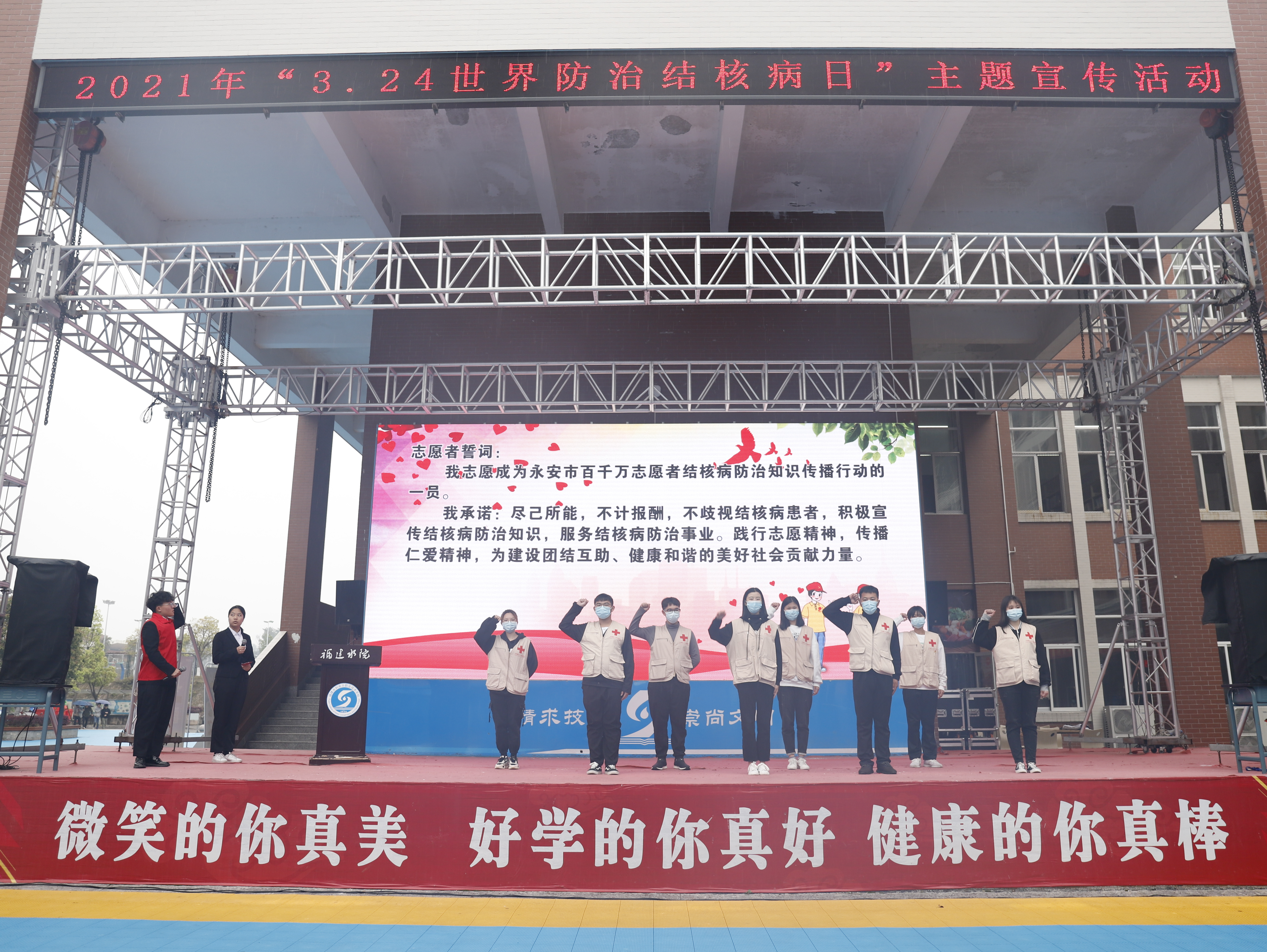 活动中,全体志愿者宣读结核病防治志愿者誓词:“我志愿成为永安市百千万志愿者结核病防治知识传播行动的一员。我承诺:尽己所能,不计报酬,不歧视结核病患者,积极宣传结核病防治知识,服务结核病防治事业。践行志愿精神,传播仁爱精神,为建设团结互助、健康和谐的美好社会贡献力量。”他们向现场师生分发宣传用品,并组织开展现场有奖问答抽奖互动及宣传条幅签名活动。