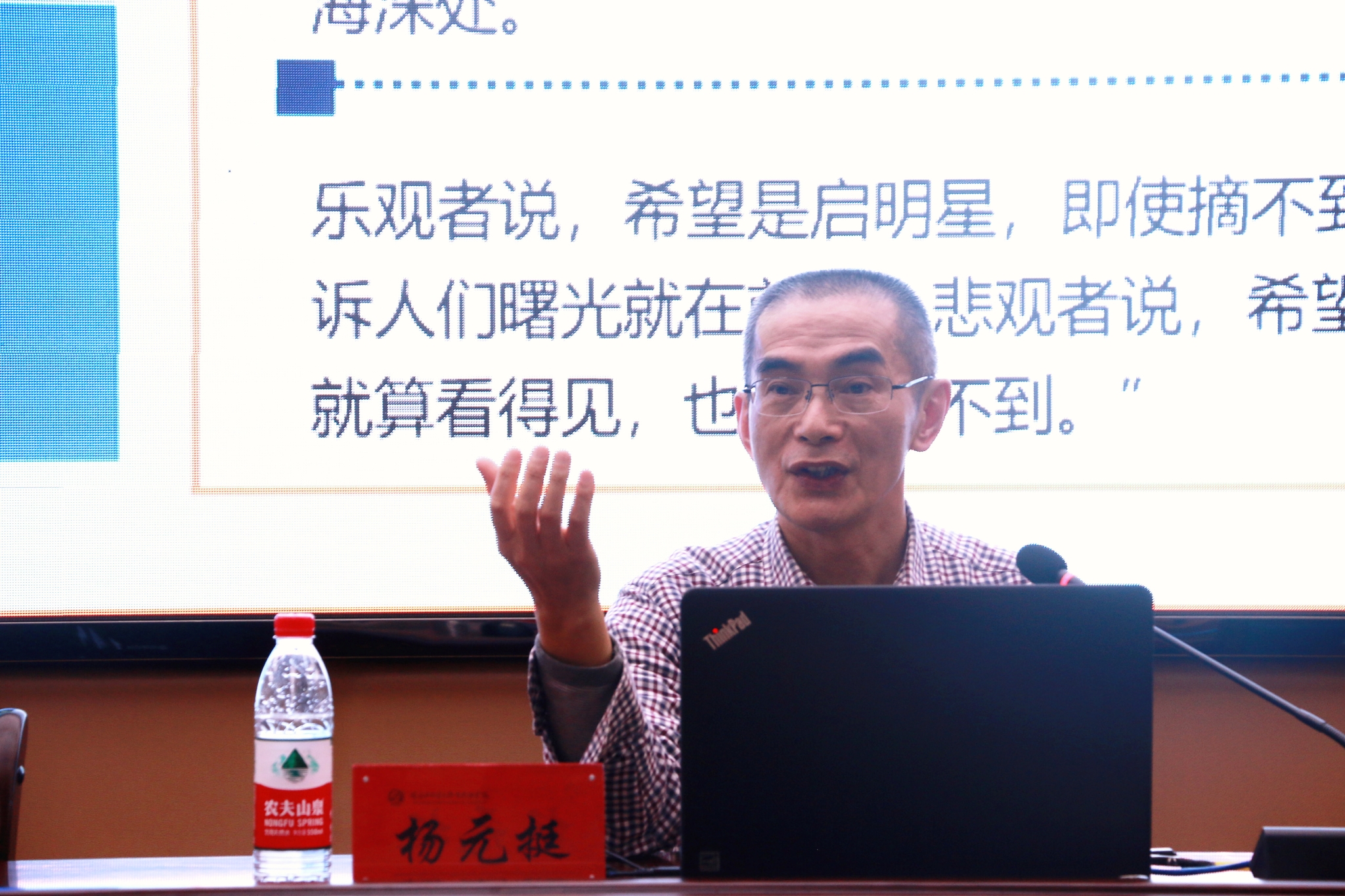 12月29日,学院院长杨元挺作了题为《做一个大气快活的人》的专题讲座。他用富有哲理的语言,发人深省的故事,结合自身的学习经历,诠释了做人、做事、做学问的真谛,以及如何心理调适与心灵养护的方法。他从“故障排查、适时维修、日常保养”三个方面,就敌对心理、小气心理、纠结心理等常见的三种心理问题进行深度剖析,引导同学们要心怀感恩、善于放下、学会吃亏、自我愉悦。同时,他还分享了自己的摄影心得,告知大家除了专业知识外,还要多学习美学,弘扬正能量。