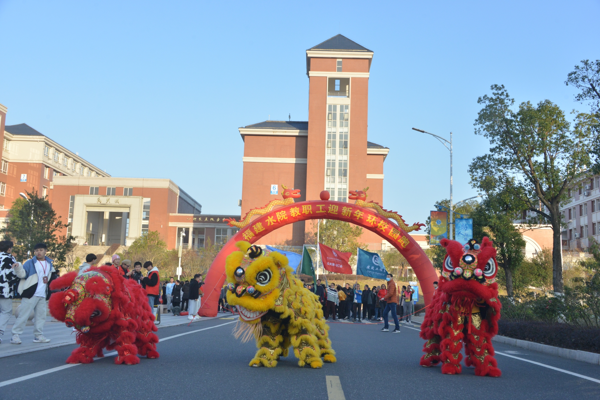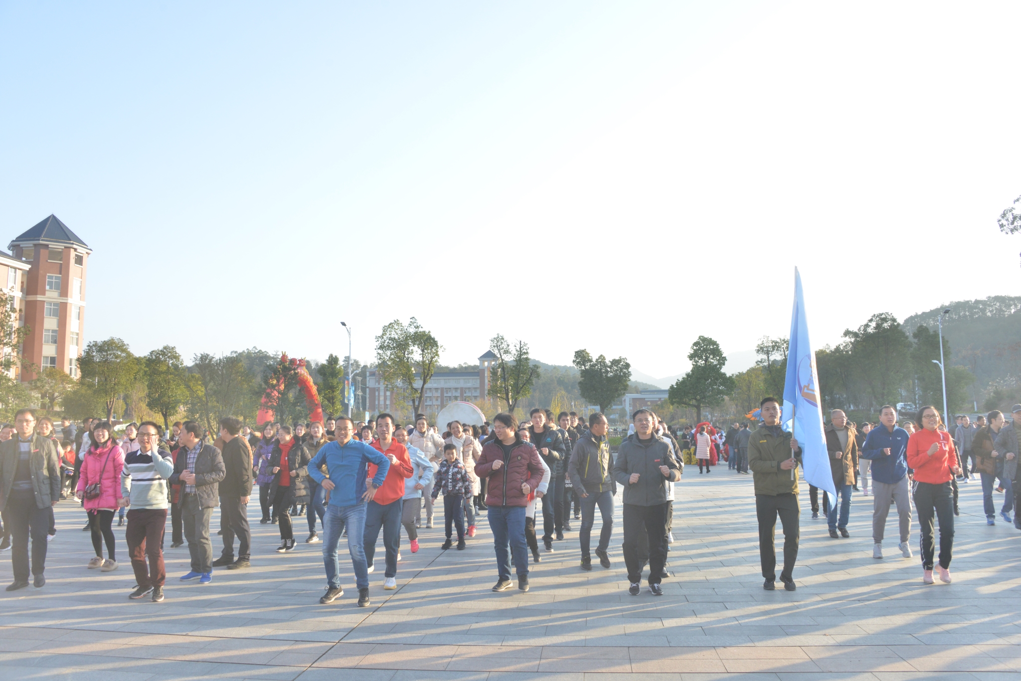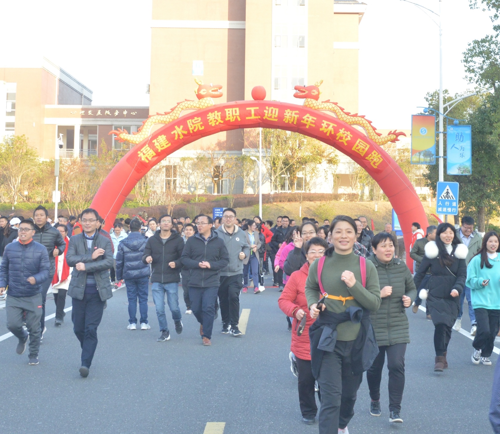 跑前热身后,在学生舞狮擂鼓助兴加油中,随着学院领导扣动发令枪,大伙儿争前恐后从路港体育馆起跑出发。教职工们迈着有力的步伐,你追我赶,以充满朝气的精神和坚韧的意志,沿着溯源路、李冰园、禹兴园、闽水大道,最后回到起点,圆满完成了2.2公里的环校园健身跑。此时虽是寒冬,但教职工们团结和奋勇前进的精神如冬日暖阳充满整个校园。