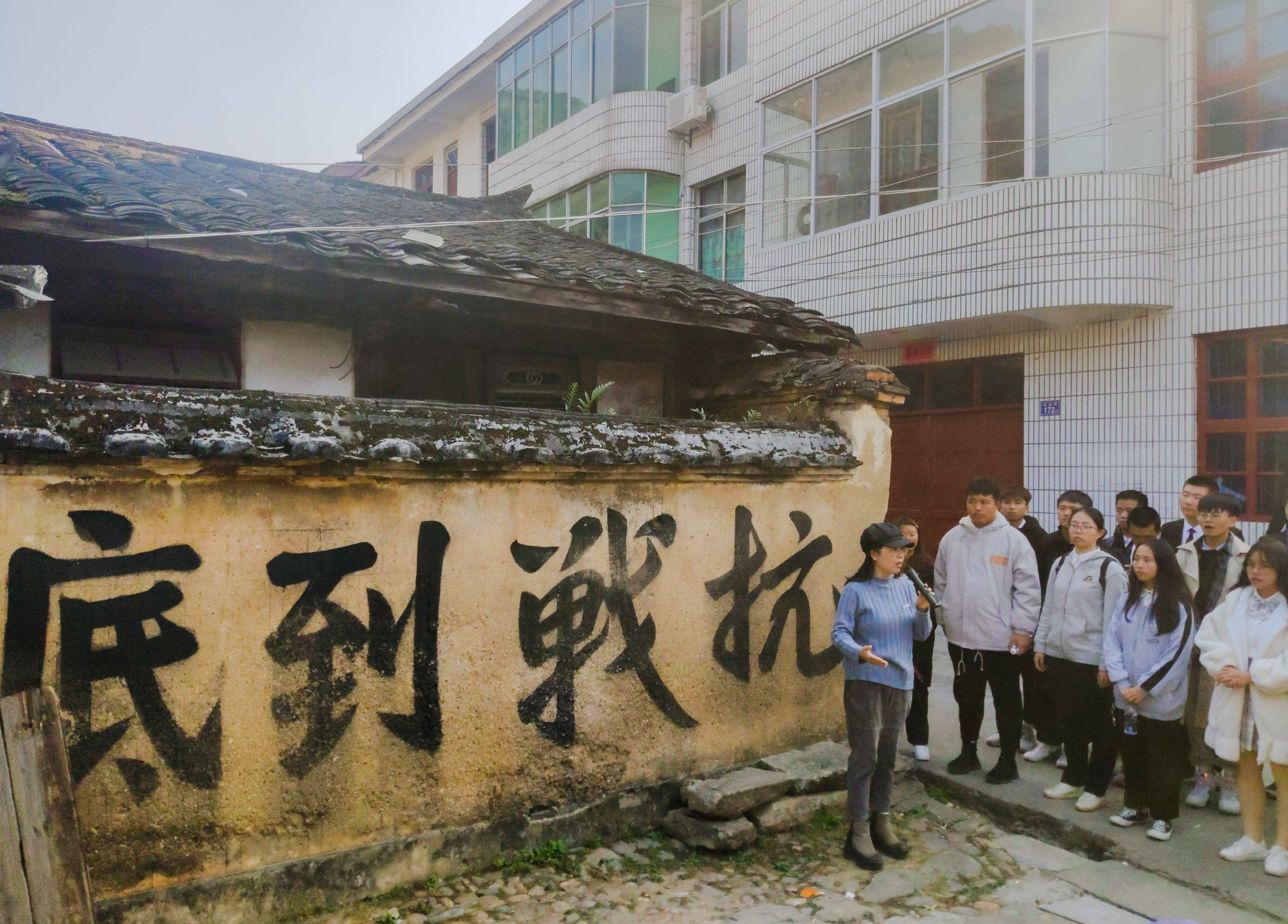 在抗战标语纪念馆现场,刘玉萍老师讲述了在民族面临灾难时期中华儿女坚持团结抗战的历史故事,鼓励同学们铭记这种“天下兴亡匹夫有责”担当精神和“抗战到底”的奋斗精神,在新的历史条件下继续前行,勇做“四有”青年。