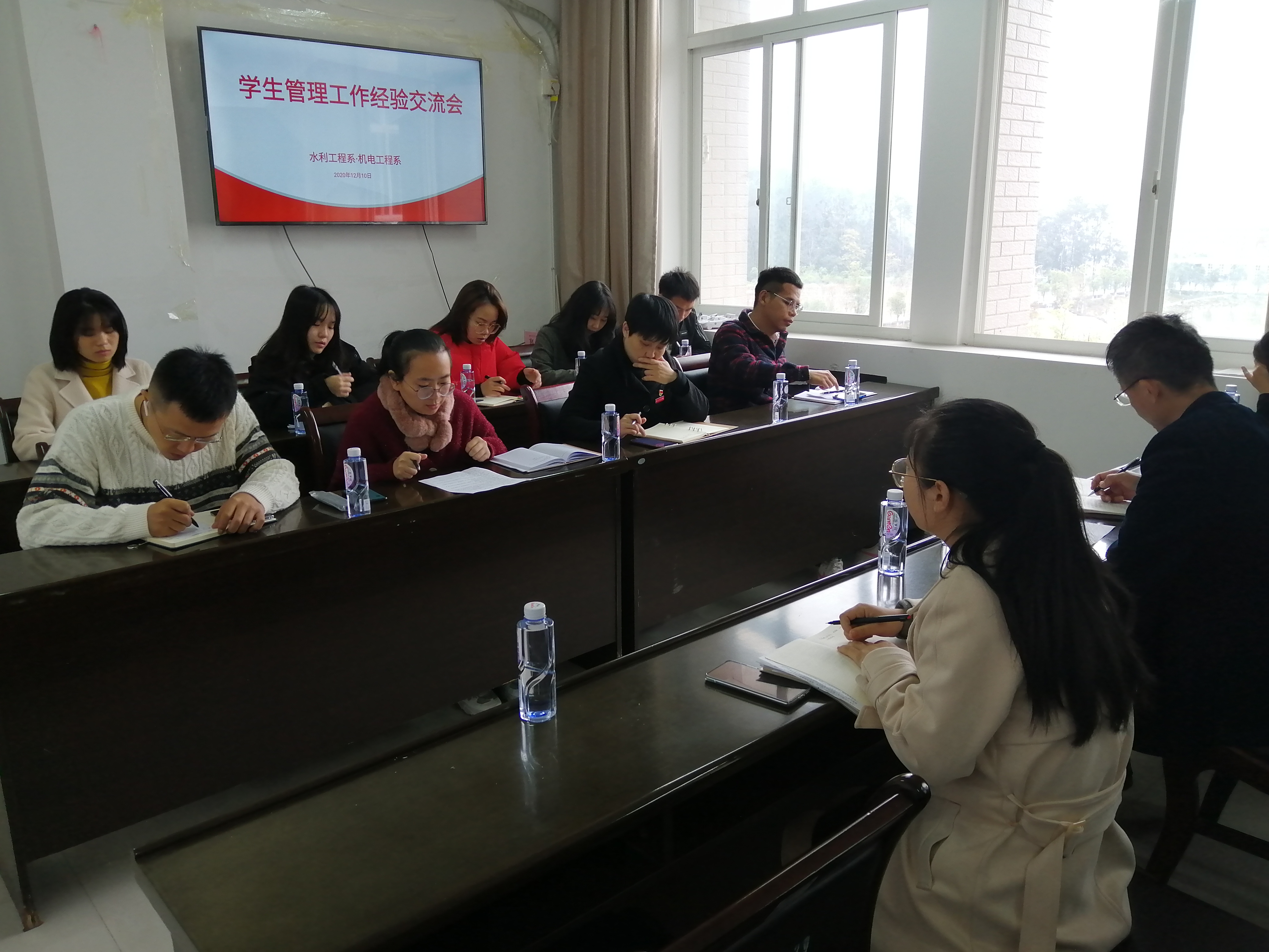 12月10日上午,水利工程系党总支书记刘华斌带领6名辅导员到机电工程系就学生宿舍管理工作进行经验交流。机电工程系党总支书记郭俊宇、团总支书记吕奕及相关专兼职辅导员参加交流座谈会。座谈会在李冰园3-536举行。