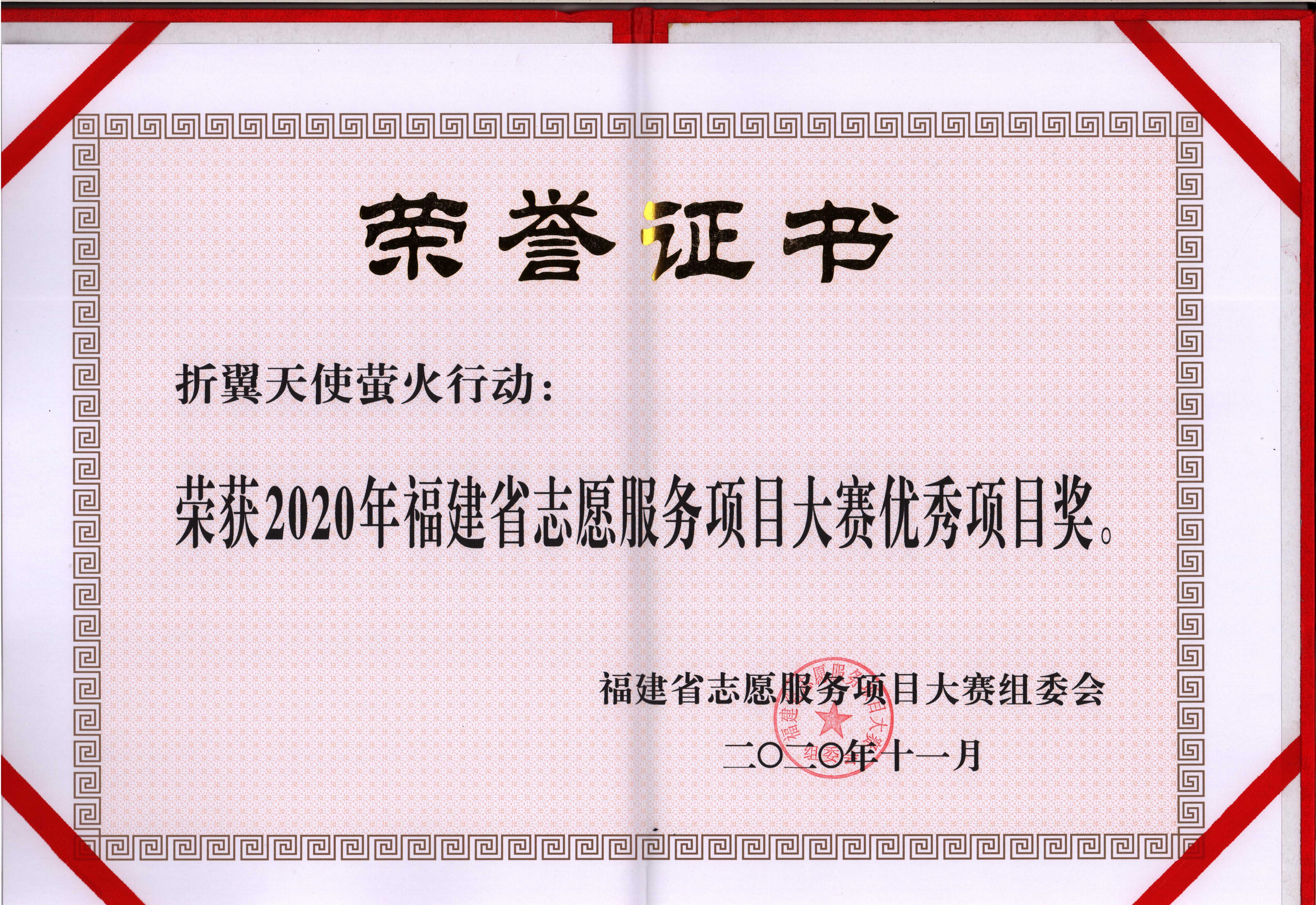 近日,由省委文明办、团省委、省民政厅、省生态环境厅、省水利厅、省卫健委、省妇联、省残联联合主办的“2020年福建省志愿服务项目大赛”结果揭晓,我院项目“折翼天使萤火行动”获得志愿服务项目大赛优秀项目奖。