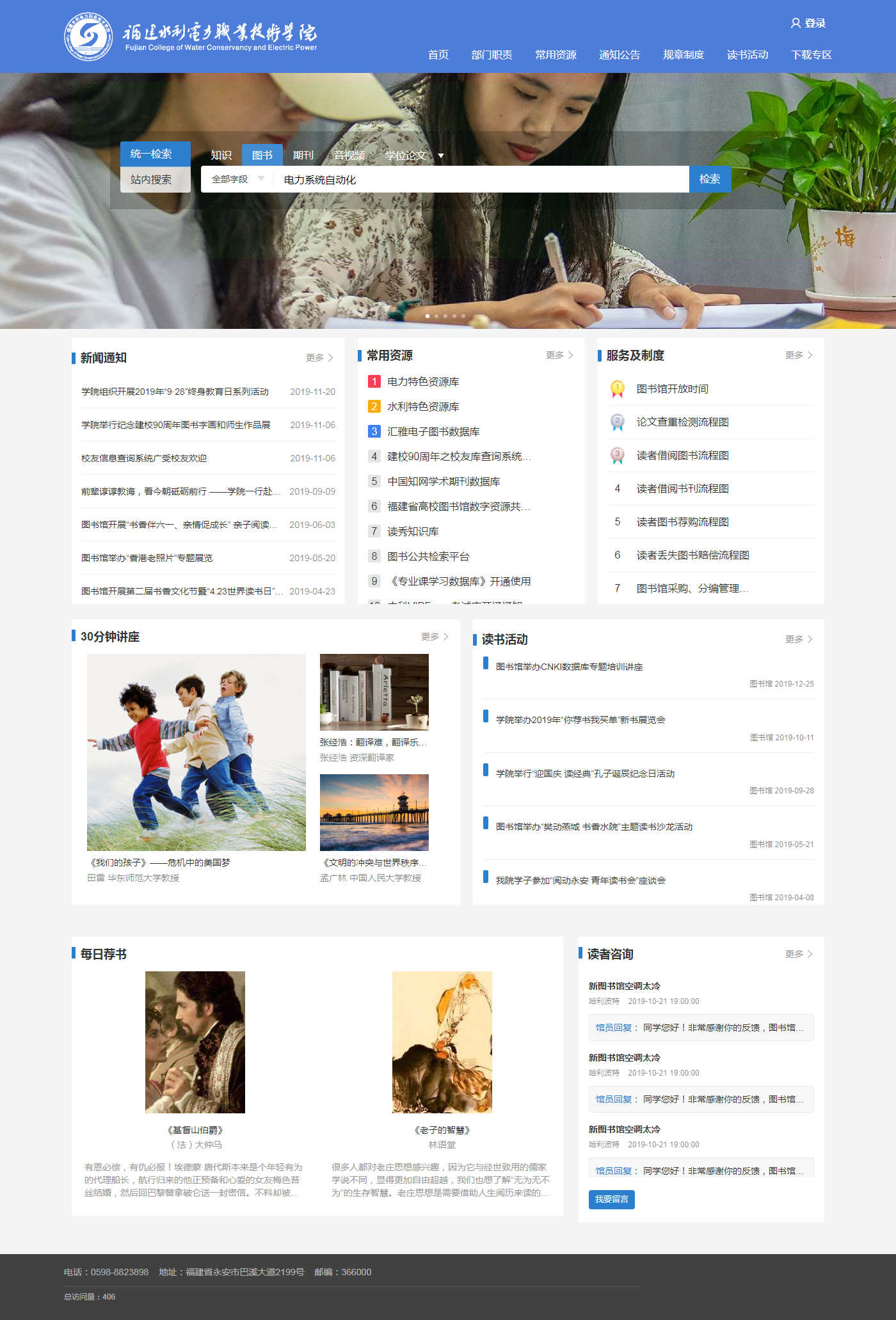 同时,门户网站与28万册的电子图书(近期完成15万册)、电力资源特色库和水利资源特色库实现对接,既是对纸质图书馆藏的有力补充,也满足了师生不同的阅读习惯和较高的学术钻研需求。