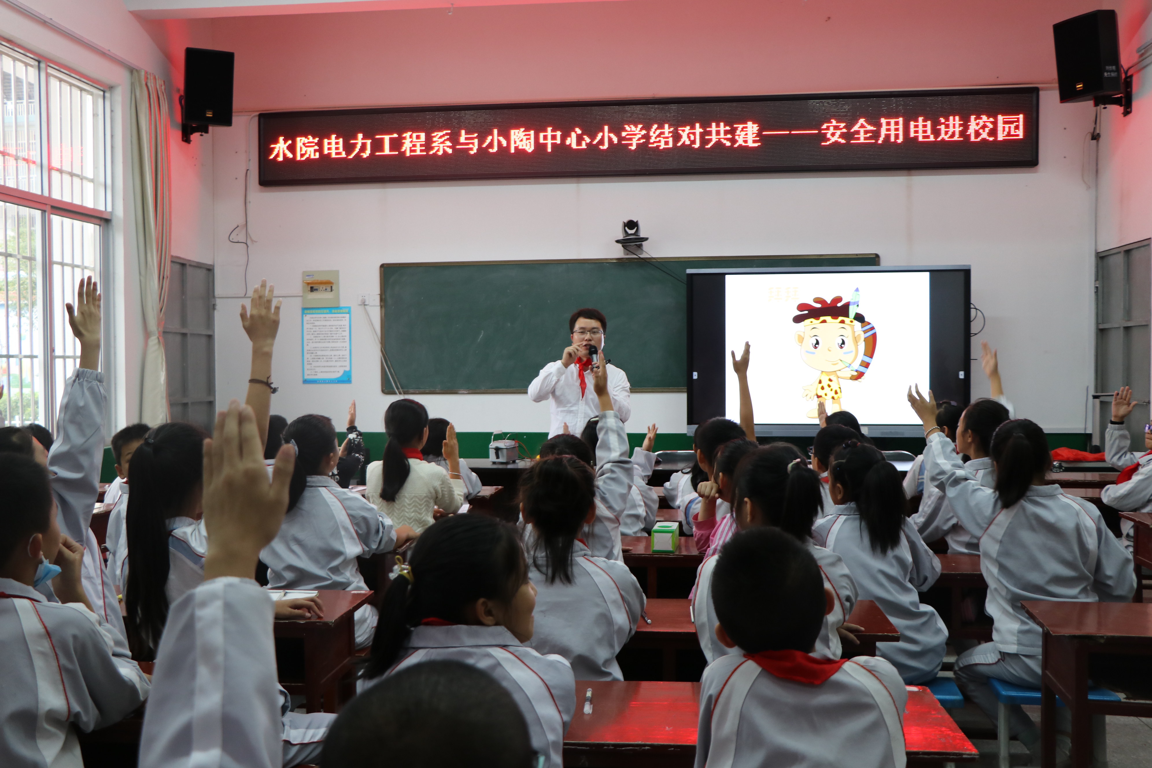 “电老虎,不讲情,用家电,要小心。插孔内,连着电,乱触碰,很危险……”10月20日,电力工程系副主任许培德携系辅导员和青年志愿者,走进小陶中心小学,给五年级的小学生们上了一堂生动有趣的电力安全科普体验课。