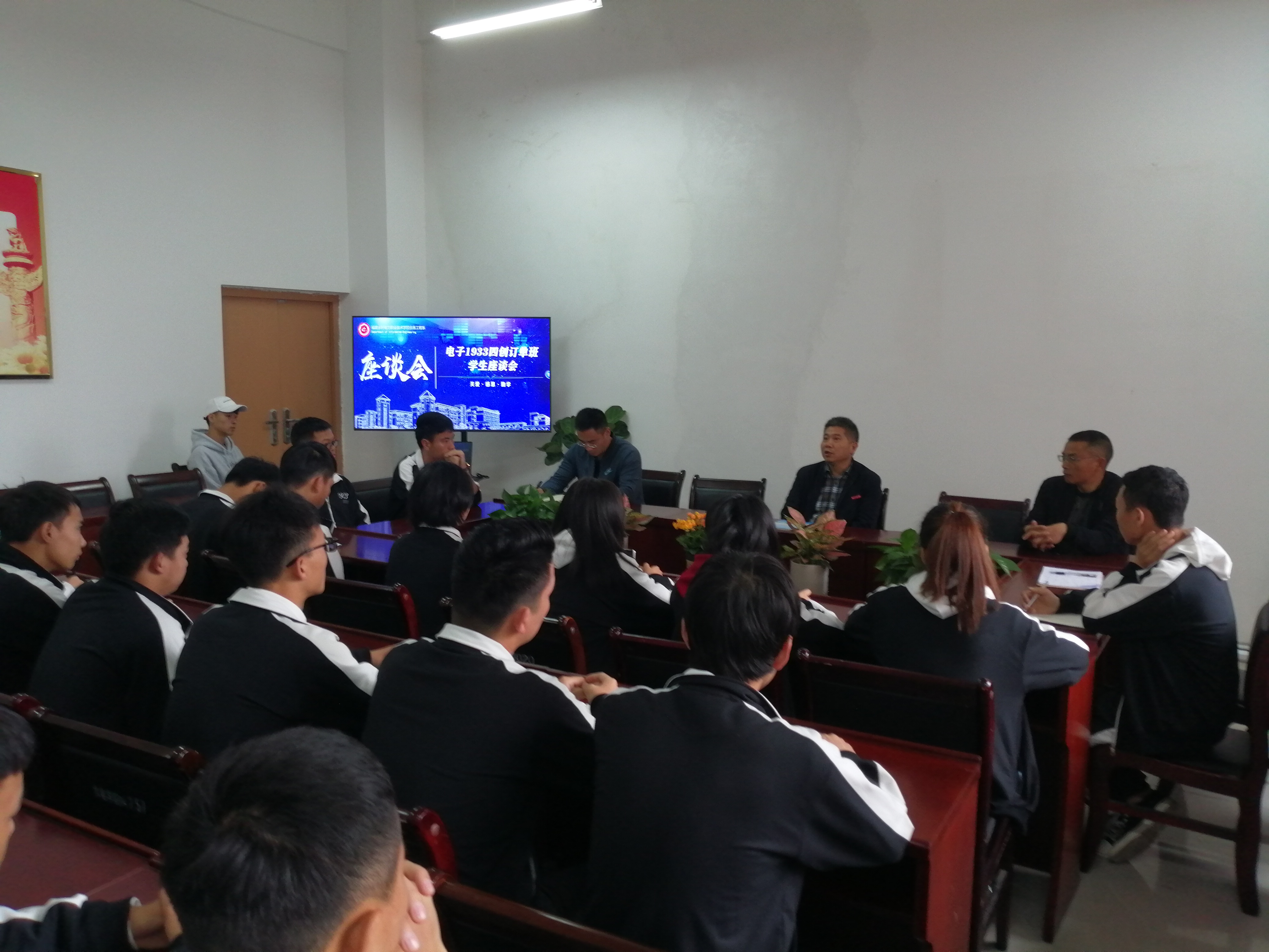 随后,电子1933四创订单班班长张俊松同学带头为大家介绍了贵州的特色文化及风土民情,并表达了对订单班学习的热切期盼。同学们也纷纷发言,提出了关于学习、生活中存在问题的意见和建议。对于同学们的提问,朱庆喜老师给予了一一解答。陈贤章、陈德峰老师分别就专业教学与订单培养的模式等方面与同学们进行了交流与分享,希望同学们把校园良好人文风采带回贵州老家,让订单班办学规模不断壮大。