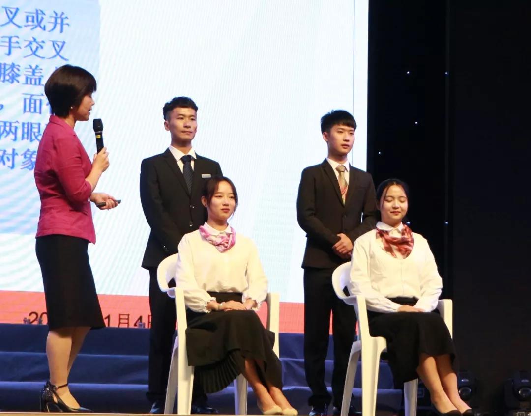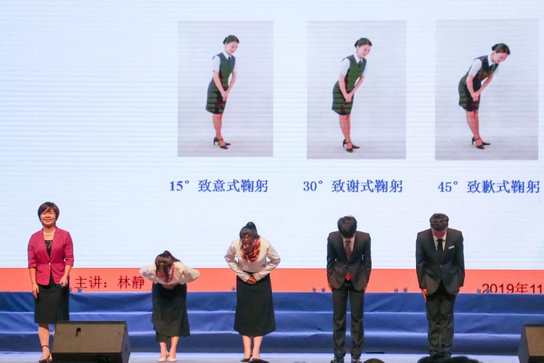 林静老师迈着沉稳自信的步伐走上台来,含笑而立,亲切开讲。她首先由“首映效应”引出了学习礼仪知识的重要性,并就“如何塑造完美的第一印象”与同学们展开互动。她从职业形象的仪容、仪表以及仪态三个方面详细地介绍了如何保持良好的职业形象,并通过现场示范的方式诠释了求职仪态礼仪及求职交流沟通礼仪。最后,林静老师以“礼则雅言,仪则雅态”结束了本场讲座,她生动有趣的讲解让在场的每一位听众受益匪浅。