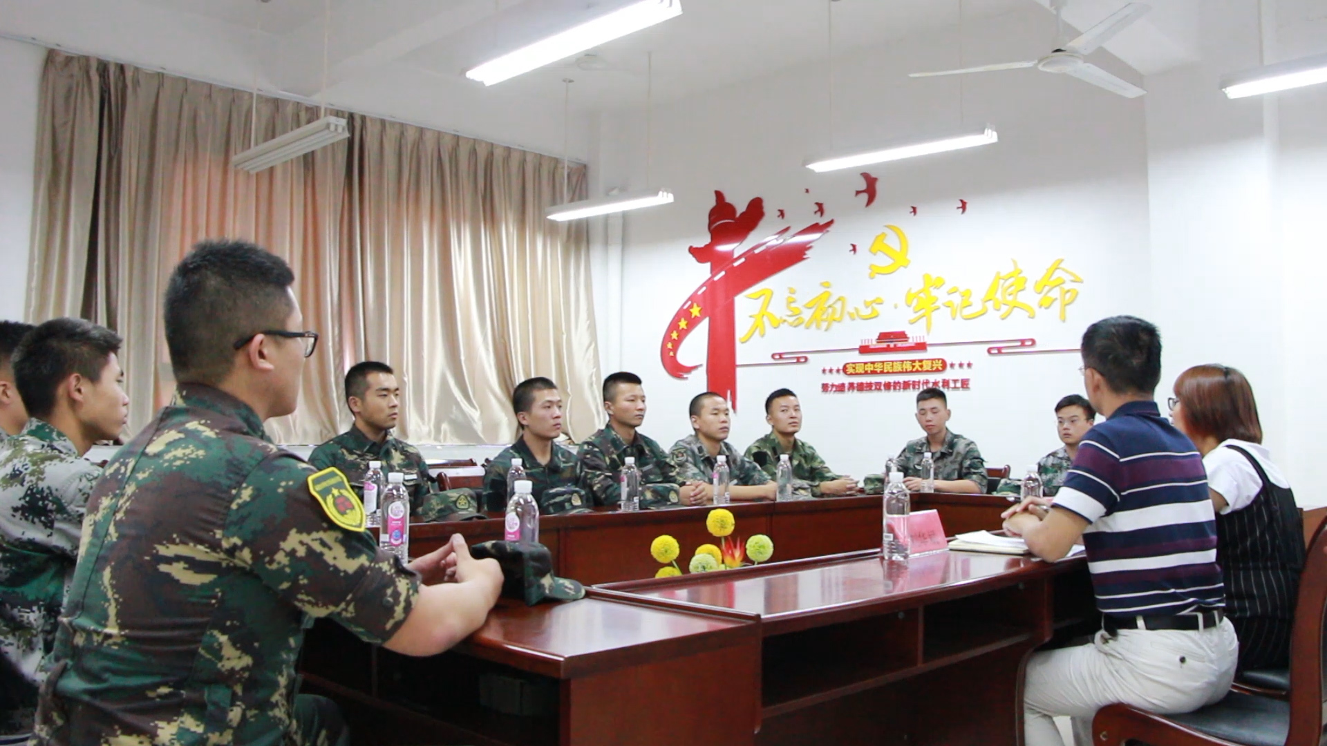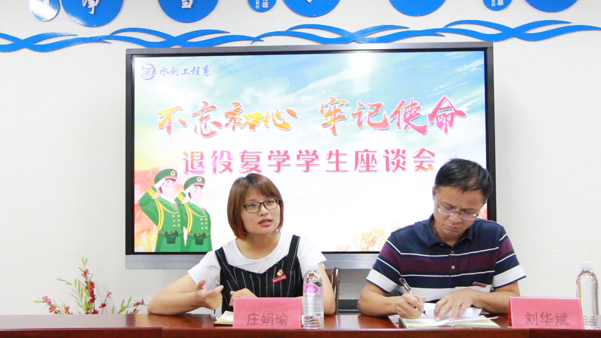9月23日下午,水利工程系在系会议室组织召开了2019年退役复学学生座谈会。系党总支书记刘华斌、团总支书记庄娟瑜、退役复学老生代表以及2019年全体退伍学生参加了座谈会,会议由庄娟瑜主持。