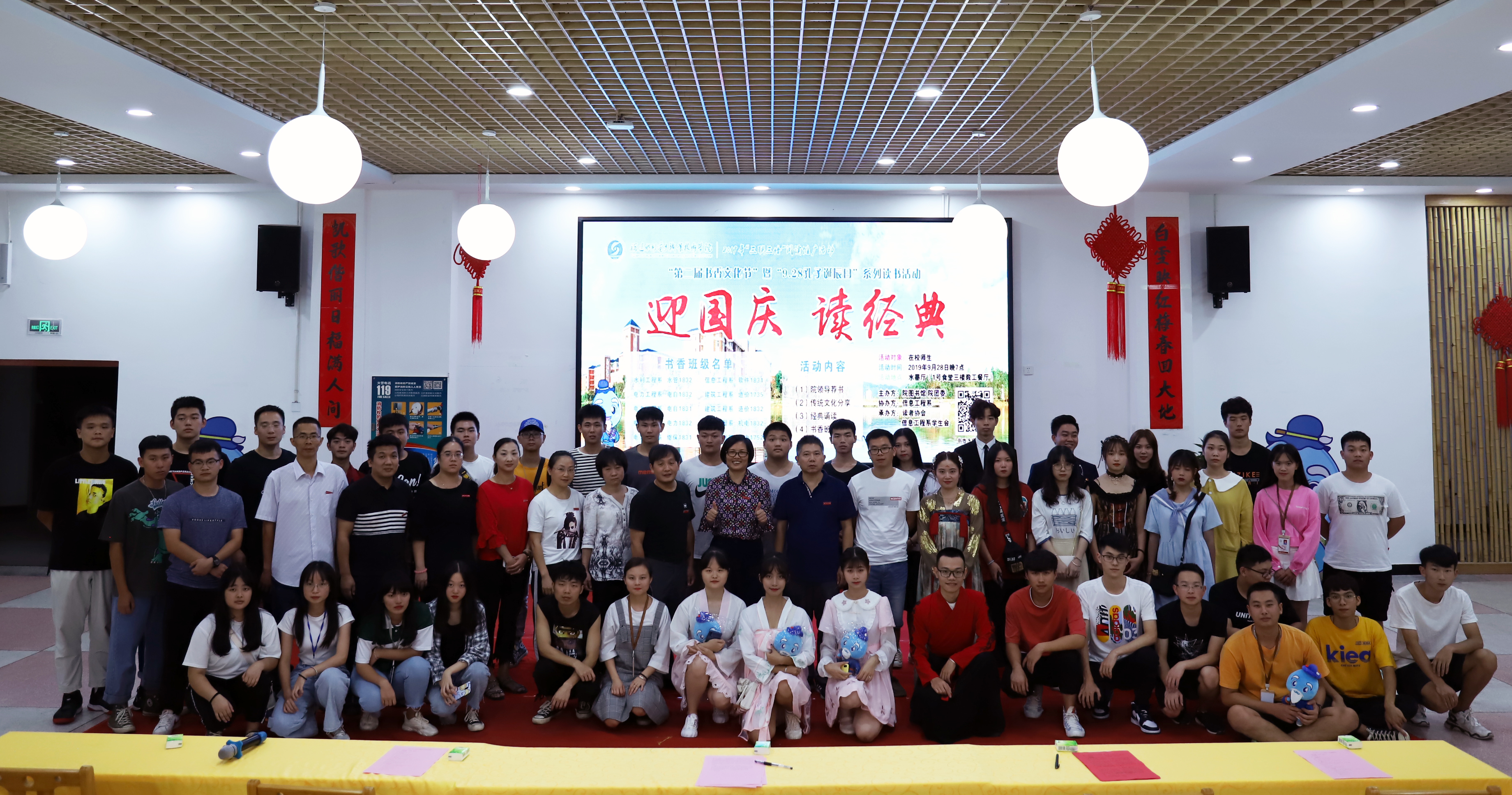 9月28日晚,学院图书馆联合院团委、信息工程系在教工食堂水墨大厅举办了一场以“迎国庆 读经典”为主题的“9.28孔子诞辰纪念日”经典阅读推广活动。党委副书记黄瑞梅,信息工程系党总支书记朱庆喜,图书馆、院团委、各系部相关老师出席,读书协会及其他读书爱好者共150余人参加了活动。