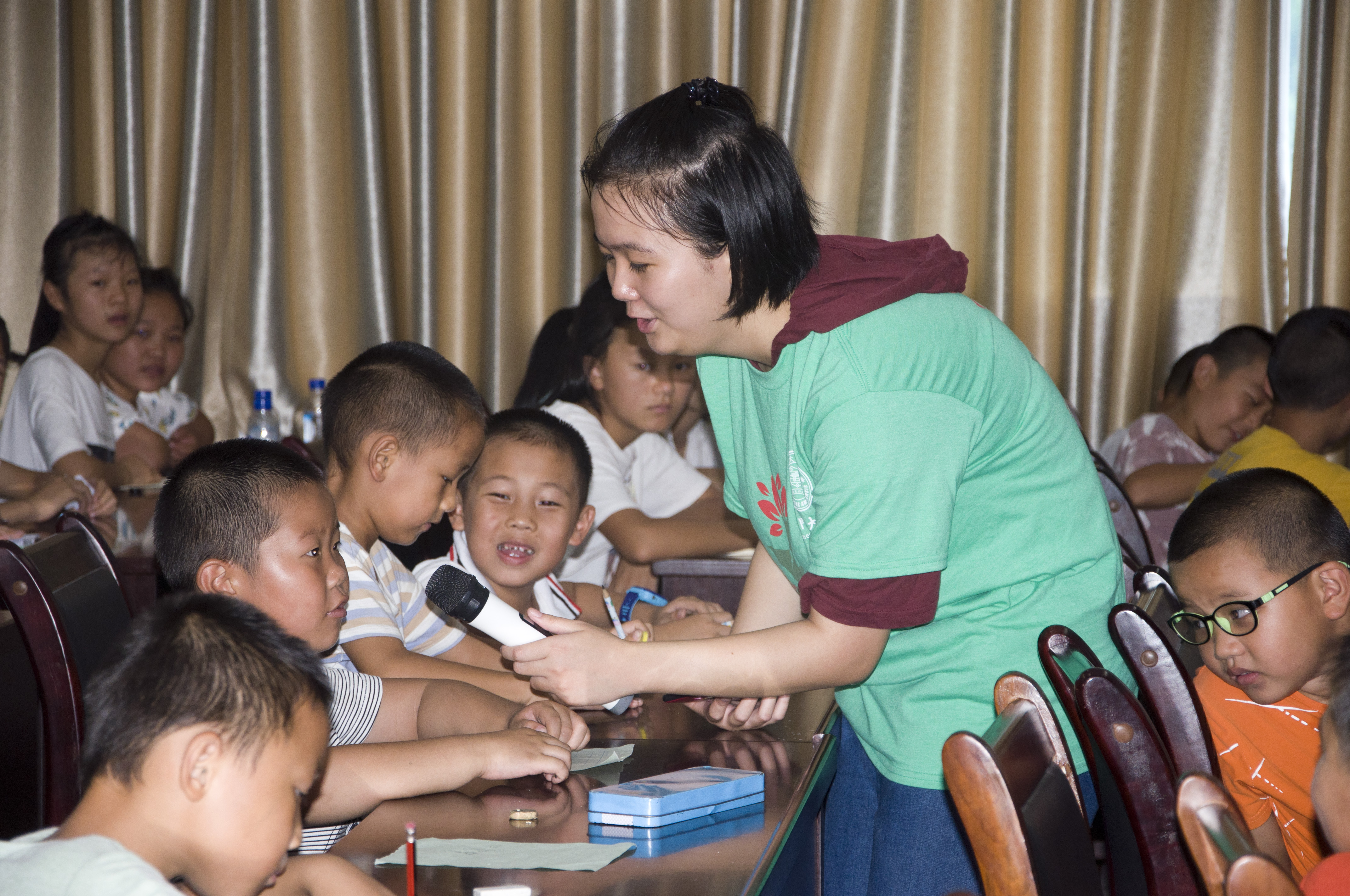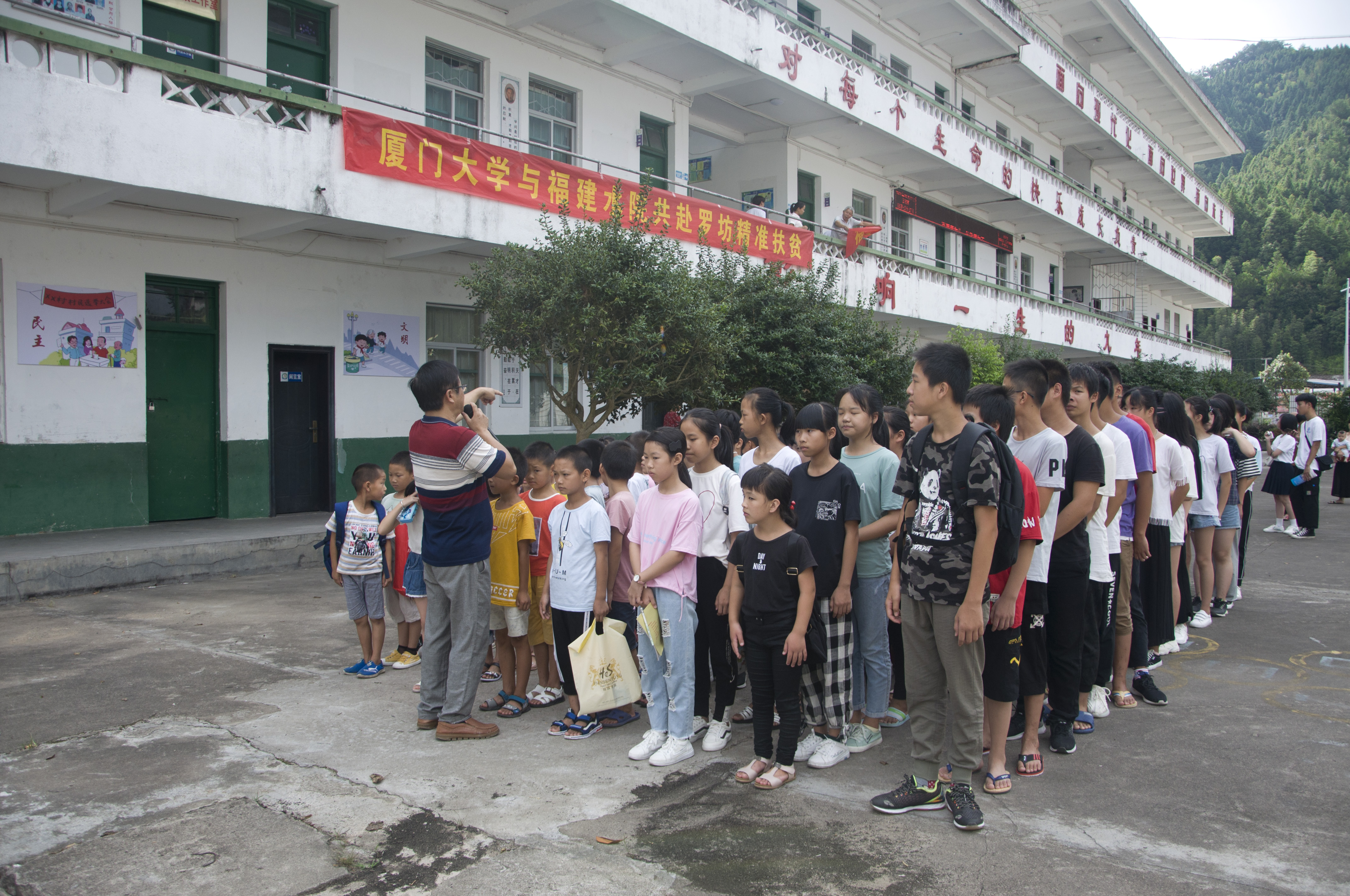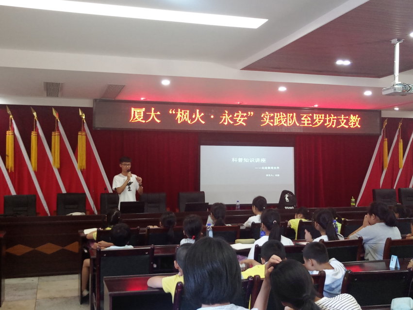 在罗坊中心校的操场上,一年级至七年级的一百余名学生与实践队共同举行了“厦大与水院共赴罗坊支教+乡村振兴”开班仪式,随后,支教队成员与小朋友们开展了破冰游戏和心理一对一辅导。同时,支教队还在乡政府会议室举办了课堂教学,以调动学生学习积极性,帮助农村儿童拓宽知识面。