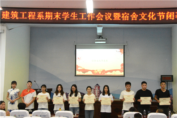 6月18日下午,建筑工程系在学术报告厅召开了期末学生工作会议暨宿舍文化节闭幕仪式。建筑系党总支临时负责人詹述琦、团总支书记邓婷婷、全体专兼职辅导员及同学代表参加会议。