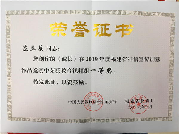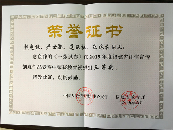 近日,由福建省教育厅、中共福建省委文明办、中国人民银行福州中心支行联合举办的“福建省征信宣传创意作品竞赛”颁奖仪式在福州举行。经地市初评、专家评选、网络投票等环节,我院视频作品《诚长》《一张试卷》分别荣获教育系统视频组一等奖、三等奖,平面作品《指纹征信》获平面组二等奖,同时,我院还获得组织奖(全省三所高校)。