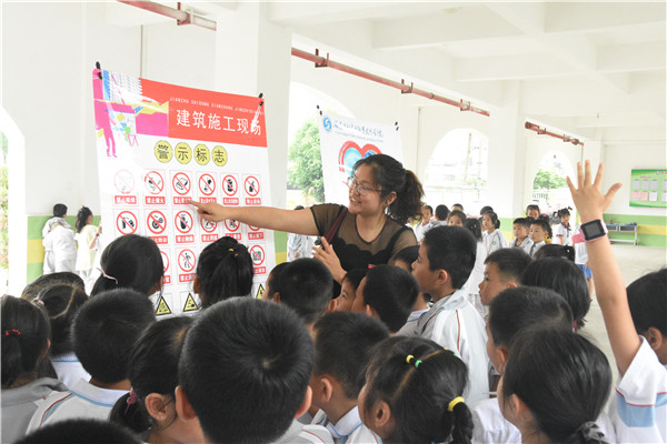 活动还就防灾减灾知识进行了宣传讲解,志愿者们教会小朋友认识建筑工地安全标识,在雷雨天地如何躲避;遇见洪水应该怎么办;发生火灾该如何求救和自救等等,受到南门小学的老师们的一致好评,表示此次的讲解让小学生们感觉更直观且加深了印象。