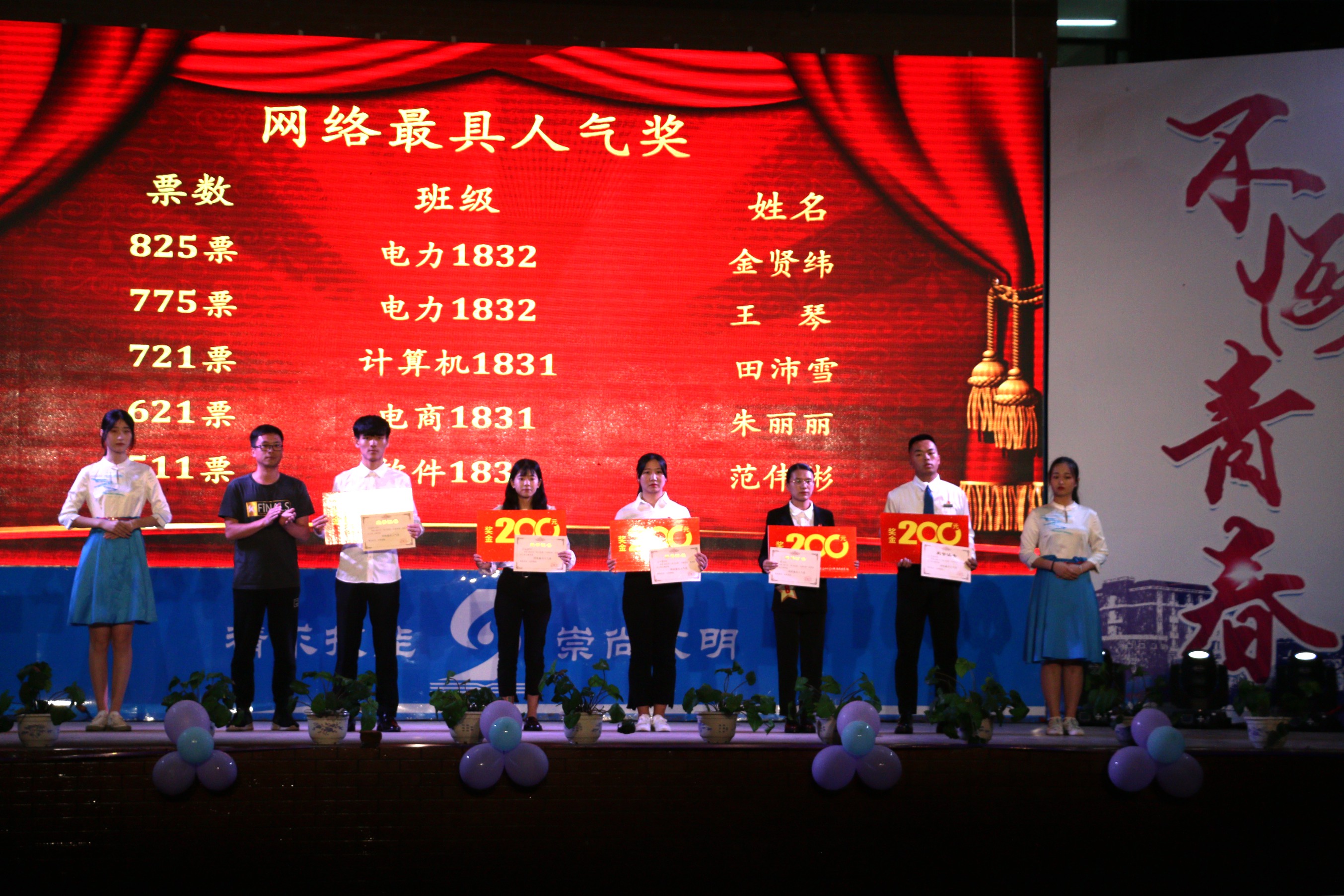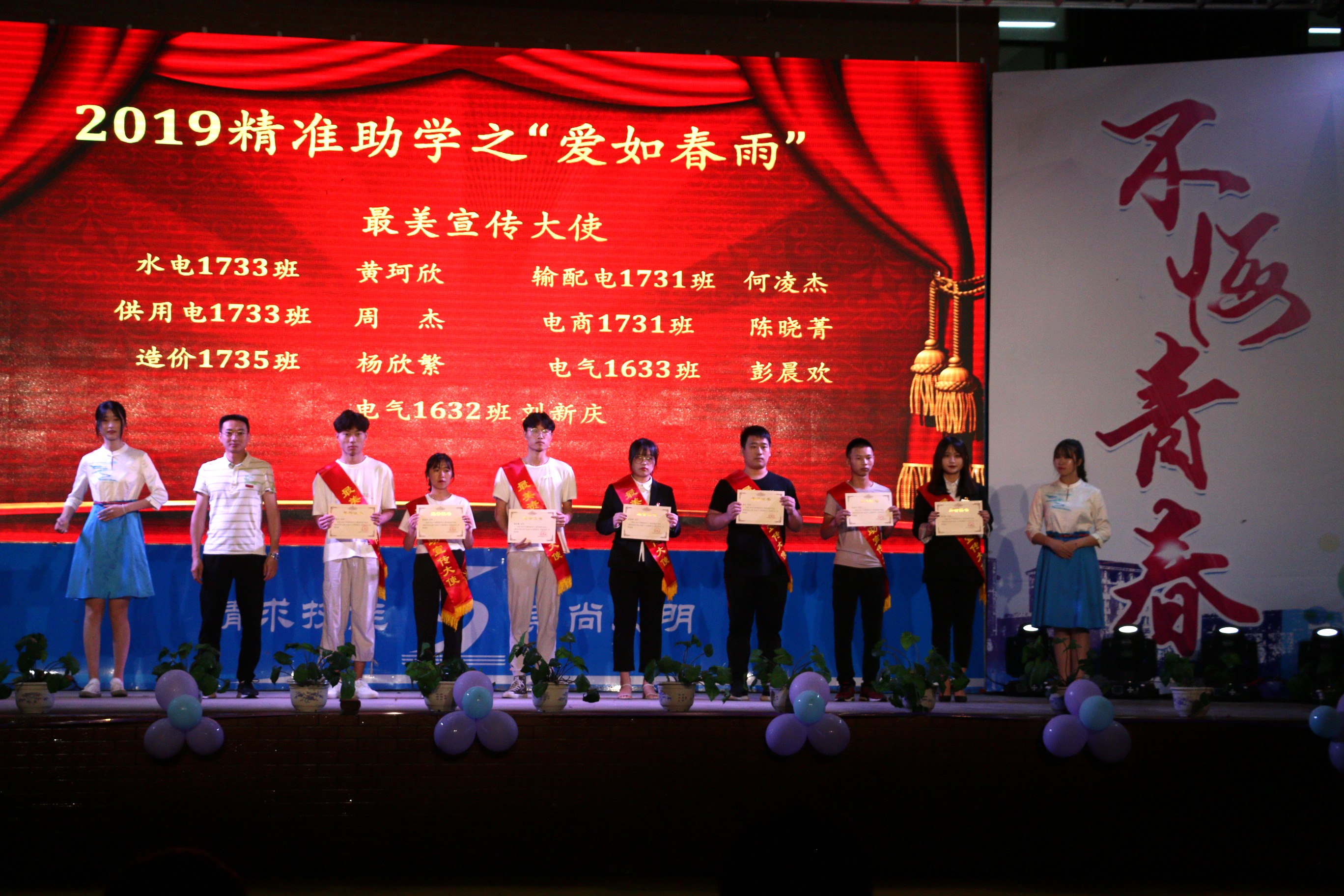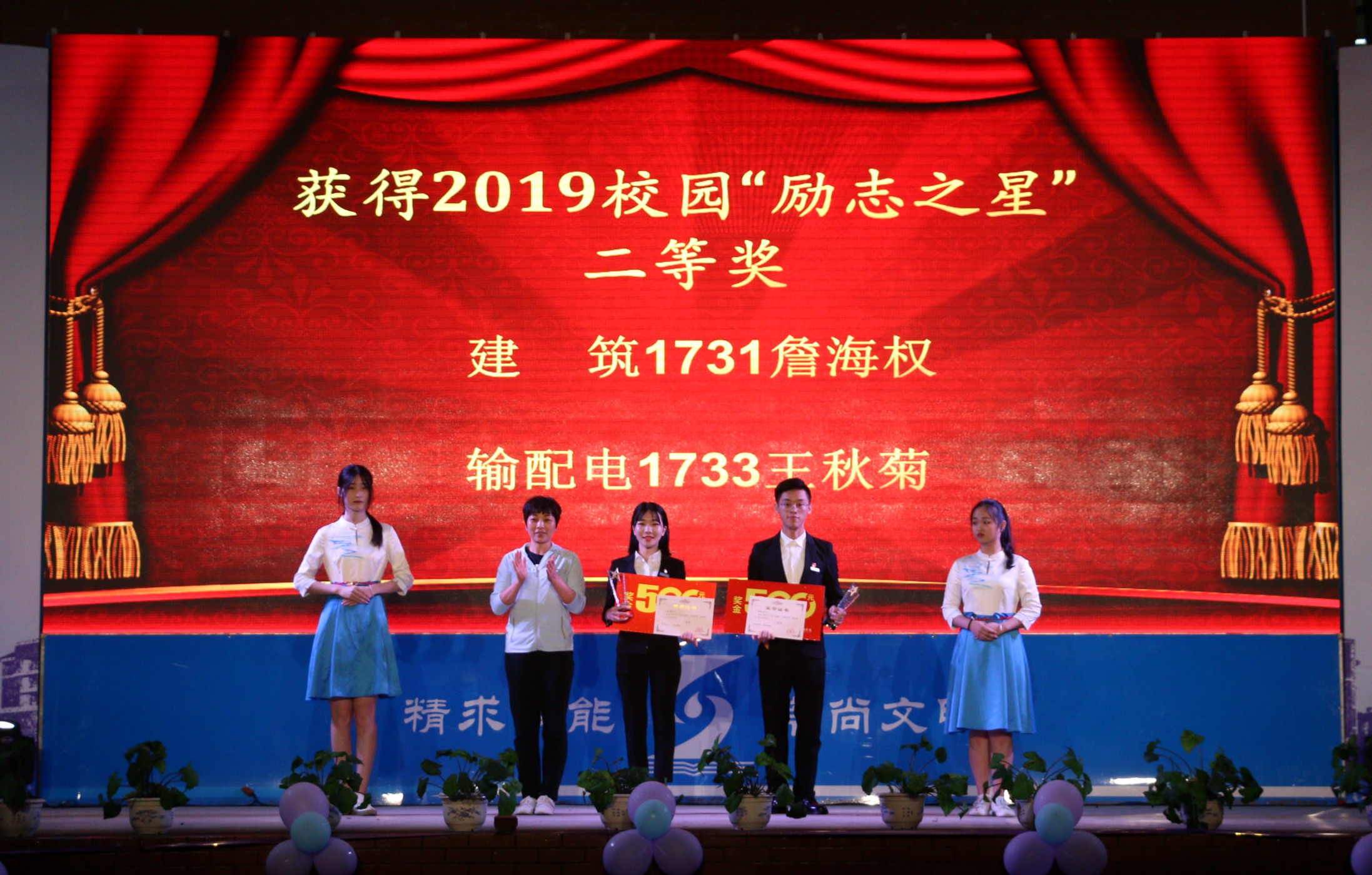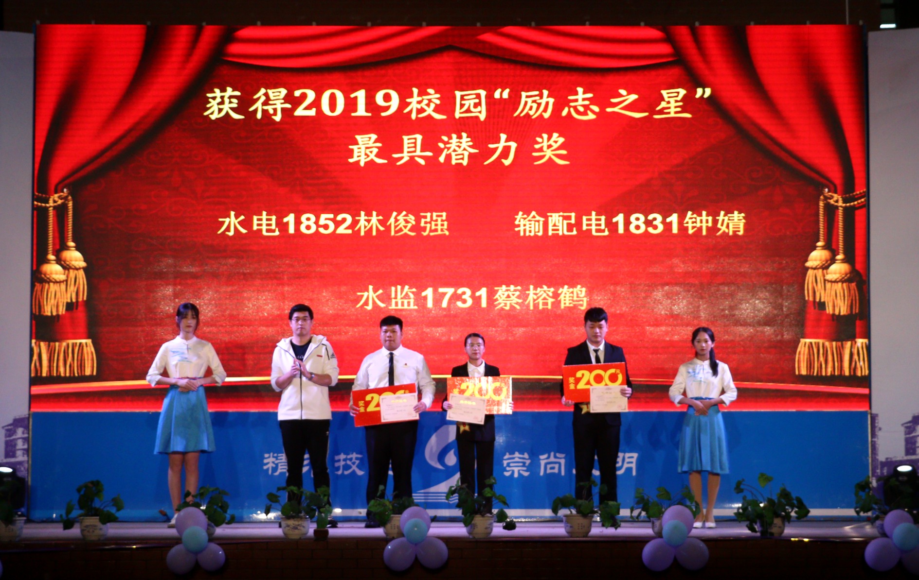经过1个多小时的风采展示,建筑工程系造价1735班杨欣繁同学获得励志之星人物评选一等奖;建筑工程系建筑1731班詹海权、电力工程系输配电1733班王秋菊获得二等奖;信息工程系计算机1732班蓝晓锋、电子1731班罗年燧、机电工程系数控1821班黄智彬获得三等奖;公共基础部水电1852班林俊强、电力工程系输配电1831班钟婧、水利工程系水监1731班蔡榕鹤获得励志之星人物评选最具潜力奖;电力1832班金贤纬和王琴、计算机1831班田沛雪、电商1831班朱丽丽、软件1832班范伟彬获得励志之星人物评选网络最具人气奖。活动还对2019年精准助学之“爱如春雨”活动中“最美宣传大使”进行了表彰。